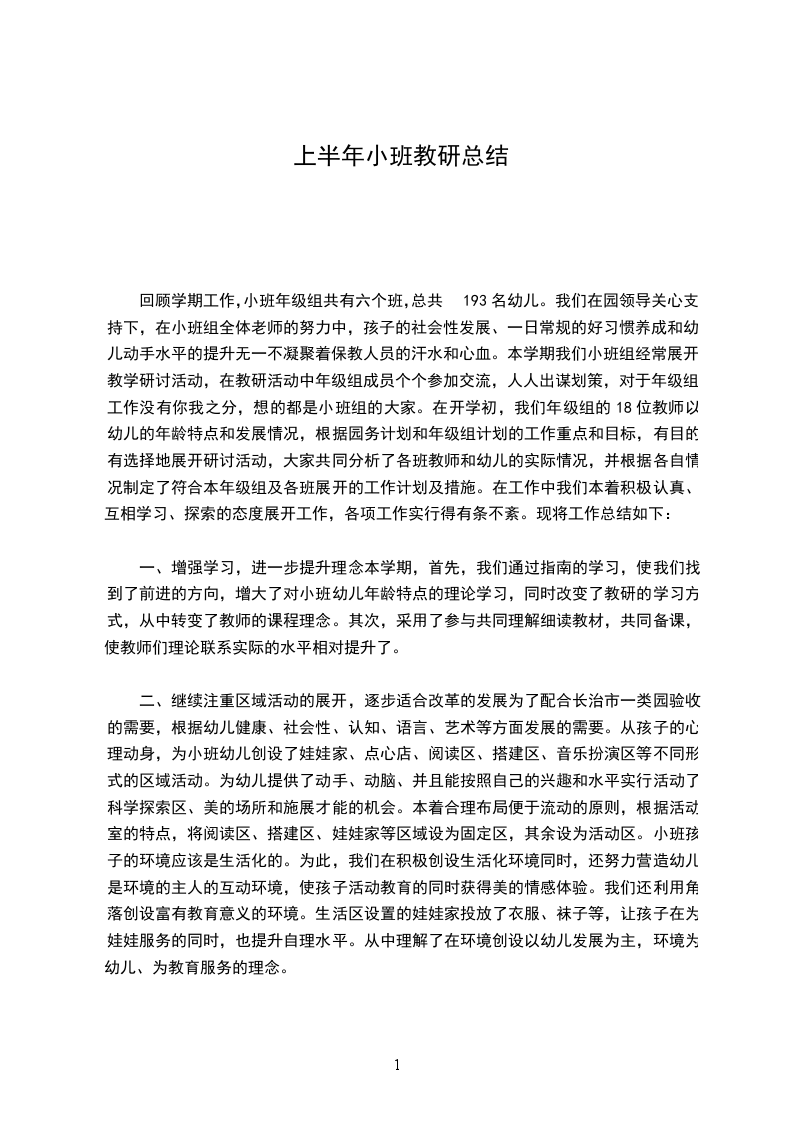回顾学期工作,小班年级组共有六个班,总共193名幼儿。我们在园领导关心支持下,在小班组全体老师的努力中,孩子的社会性发展、一日常规的好习惯养成和幼儿动手水平的提升无一不凝聚着保教人员的汗水和心血。本学期我们小班组经常展开教学研讨活动,在教研活动中年级组成员个个参加交流,人人出谋划策,对于年级组工作没有你我之分,想的都是小班组的大家。在开学初,我们年级组的18位教师以幼儿的年龄特点和发展情况,根据园务计划和年级组计划的工作重点和目标,有目的有选择地展开研讨活动,大家共同分析了各班教师和幼儿的实际情况,并根据各自情况制定了符合本年级组及各班展开的工作计划及措施。在工作中我们本着积极认真、互相学习、探索的态度展开工作,各项工作实行得有条不紊。现将工作总结如下: