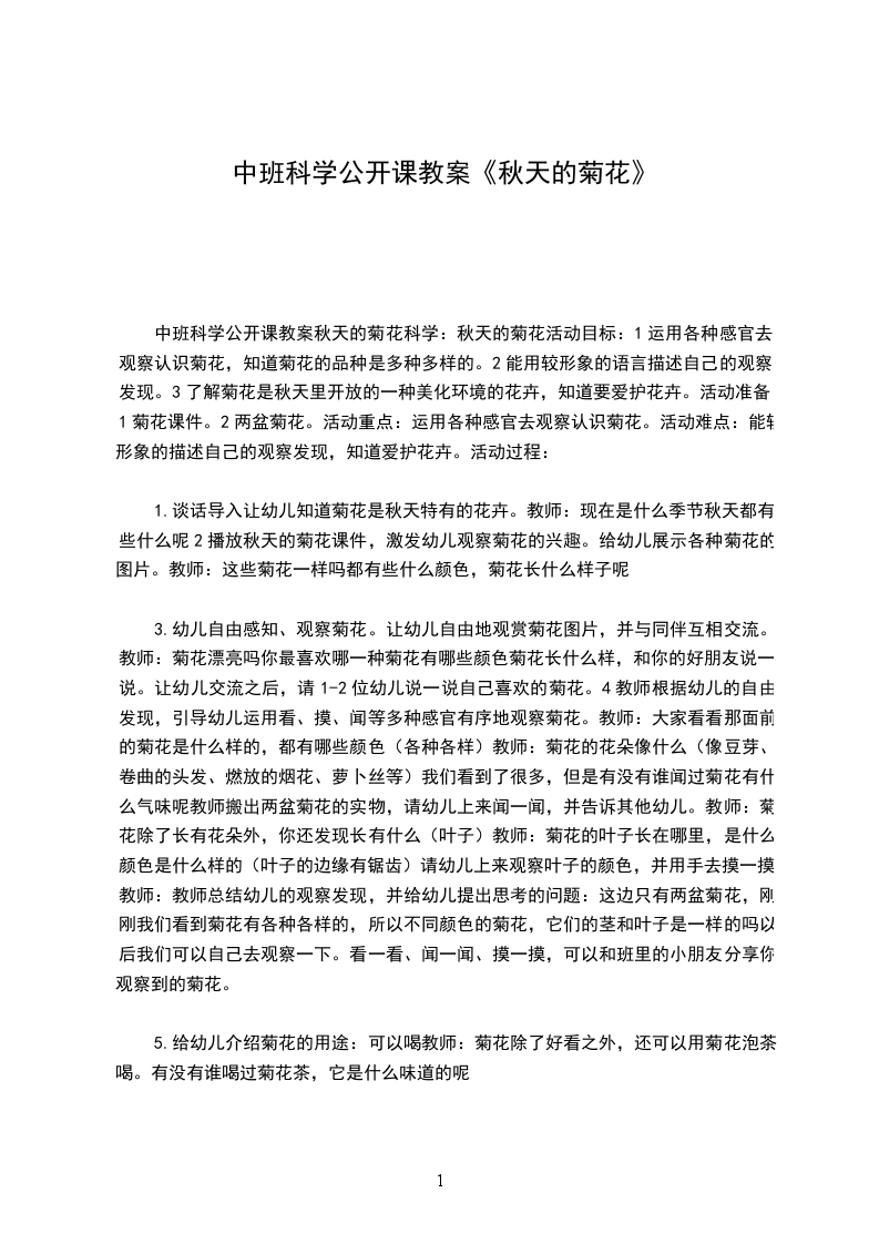 中班科学公开课教案秋天的菊花科学:秋天的菊花活动目标:1运用各种感官去观察认识菊花,知道菊花的品种是多种多样的。2能用较形象的语言描述自己的观察发现。3了解菊花是秋天里开放的一种美化环境的花卉,知道要爱护花卉。活动准备:1菊花课件。2两盆菊花。活动重点:运用各种感官去观察认识菊花。活动难点:能较形象的描述自己的观察发现,知道爱护花卉。活动过程: