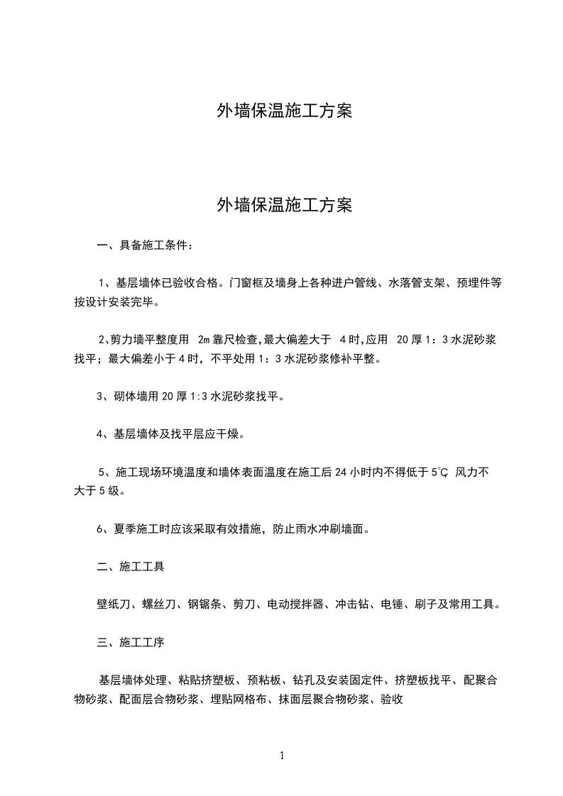 四、施工工艺说明:、外墙外保温基本构造表根据工程情况,南北XX采用水平遮阳板,东西向采用脚手架作为施工操作面。施工程序:标准层施工以层为单位,贴板从下往上,打磨、贴网、抹面从上往下。外墙外保温基本构造表基层墙体聚苯板玻纤网格布聚合物砂浆做法外墙外保温系统基本构造构造示意粘结层保温层底层防护层增强材料面层防护层外墙涂料6混凝土墙砌体墙聚合物水泥砂浆胶粘剂;必要时可加设机械锚固件聚苯乙烯泡沫塑料板聚合物抹面砂浆耐碱型玻璃纤维网格布聚合物抹面砂浆涂料;设计要求时,局部可做蚀面砖等、施工程序操作程序见下图材料准备基面准备测量、放线配胶粘剂挂基准线粘贴翻包玻纤网格布粘贴聚苯板(安装锚固件)打磨、修理、隐检抹底层抹面砂浆压入翻包及增强网格布贴网格布并将网格布压入砂浆抹面层抹面砂浆修整、验收(伸缩缝)外饰面