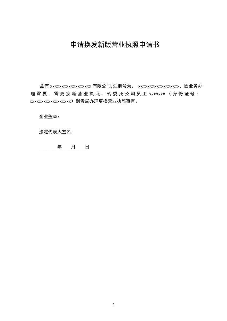 兹有xxxxxxxxxxxxxxxxxx有限公司,注册号为:xxxxxxxxxxxxxxxxxx,因业务办理需要,需更换新营业执照,现委托公司员工xxxxxxx(身份证号:xxxxxxxxxxxxxxxxxx)到贵局办理更换营业执照事宜。