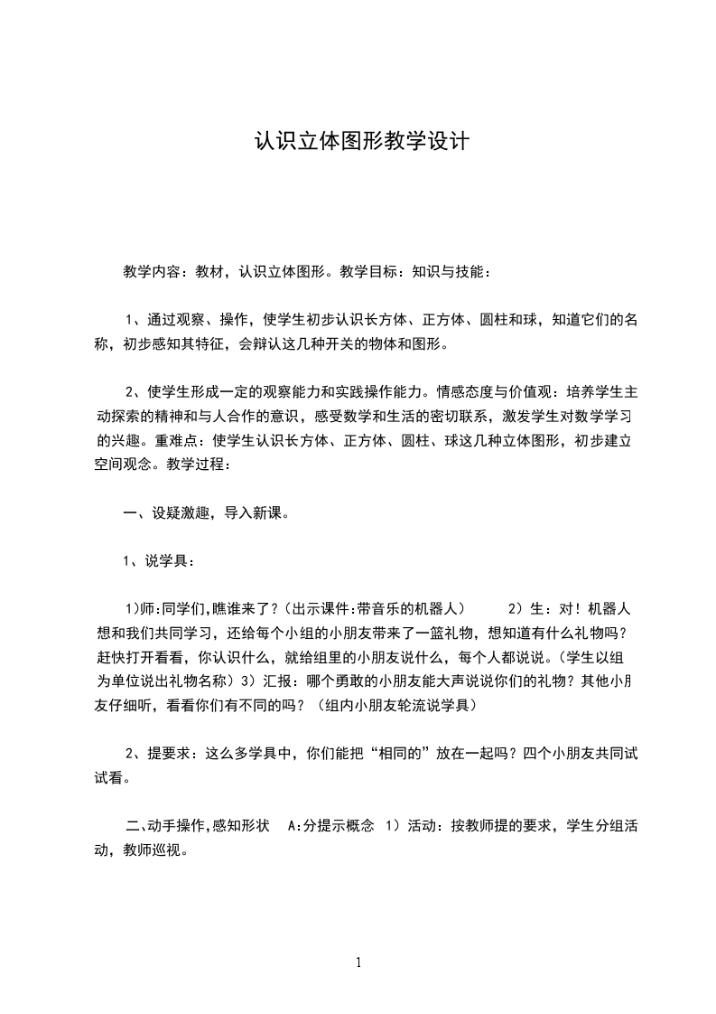 1、使学生能够认识长方体、正方体、圆柱、球等物体和形状。能够识别这几种物体和图形,初步理解相关概念的意义。