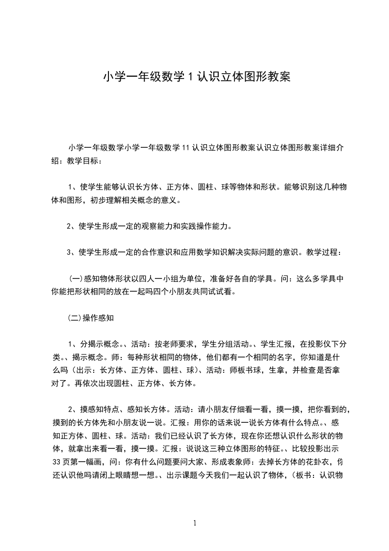 小学一年级数学小学一年级数学11认识立体图形教案认识立体图形教案详细介绍:教学目标: