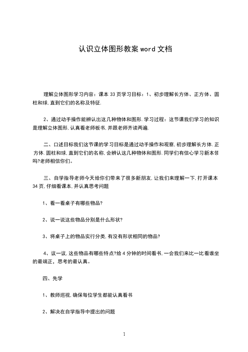 2、摸感知特点、感知长方体。活动:请小朋友仔细看一看,摸一摸,把你看到的,摸到的长方体先和小朋友说一说。汇报:用你的话来说一说长方体有什么特点。、感知正方体、圆柱、球。活动:我们已经认识了长方体,现在你还想认识什么形状的物体,就拿出来看一看,摸一摸。汇报:说说这三种立体图形的特征。、比较投影出示33页第一幅画,问:你有什么问题要问大家、形成表象师:去掉长方体的花卦衣,你还认识他吗请闭上眼睛想一想。、出示课题今天我们一起认识了物体,(板书:认识物体),他们的形状是长方体、正方体、圆柱、球。、联系生活实际说说身边哪些事物的形状是这样的