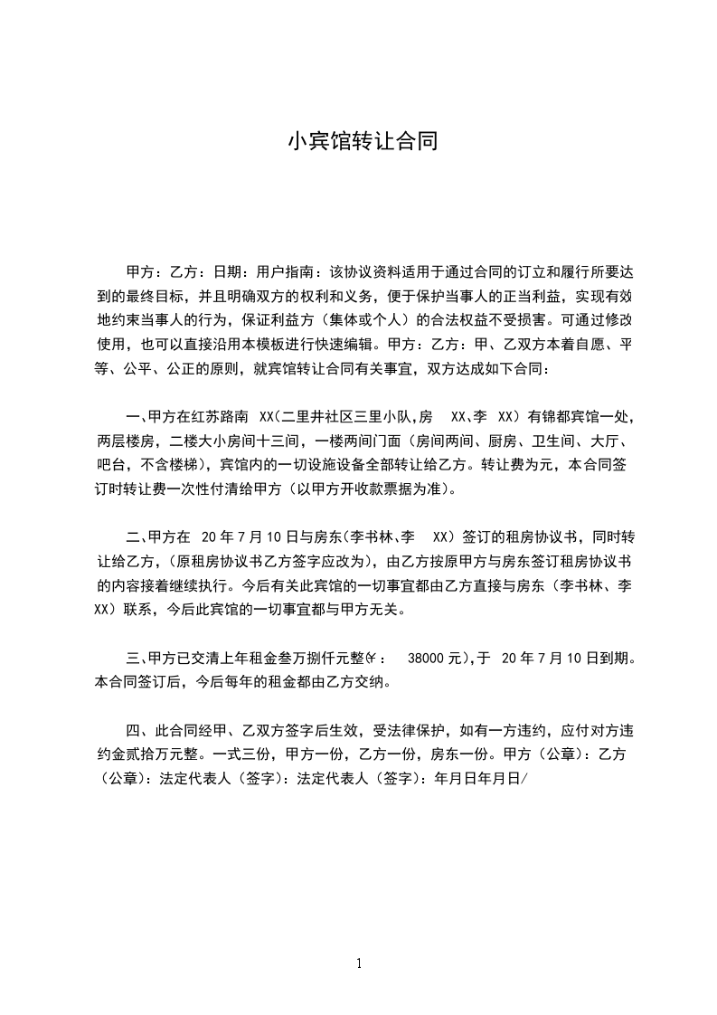 甲方:乙方:日期:用户指南:该协议资料适用于通过合同的订立和履行所要达到的最终目标,并且明确双方的权利和义务,便于保护当事人的正当利益,实现有效地约束当事人的行为,保证利益方(集体或个人)的合法权益不受损害。可通过修改使用,也可以直接沿用本模板进行快速编辑。甲方:乙方:甲、乙双方本着自愿、平等、公平、公正的原则,就宾馆转让合同有关事宜,双方达成如下合同: