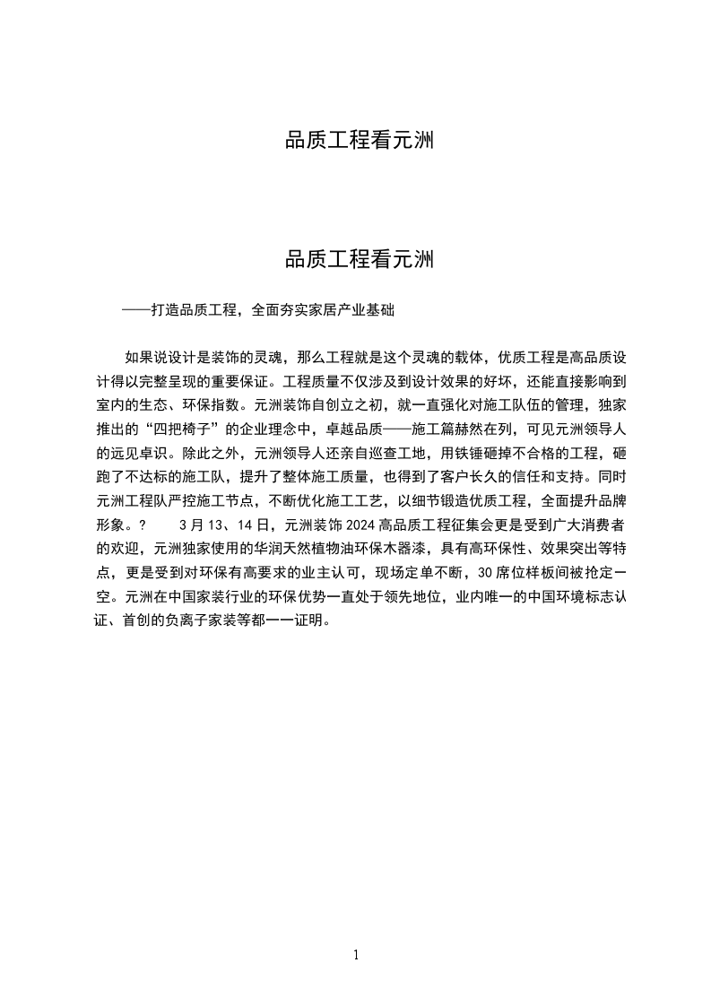 如果说设计是装饰的灵魂,那么工程就是这个灵魂的载体,优质工程是高品质设计得以完整呈现的重要保证。工程质量不仅涉及到设计效果的好坏,还能直接影响到室内的生态、环保指数。元洲装饰自创立之初,就一直强化对施工队伍的管理,独家推出的“四把椅子”的企业理念中,卓越品质——施工篇赫然在列,可见元洲领导人的远见卓识。除此之外,元洲领导人还亲自巡查工地,用铁锤砸掉不合格的工程,砸跑了不达标的施工队,提升了整体施工质量,也得到了客户长久的信任和支持。同时,元洲工程队严控施工节点,不断优化施工工艺,以细节锻造优质工程,全面提升品牌形象。? 3月13、14日,元洲装饰2024高品质工程征集会更是受到广大消费者的欢迎,元洲独家使用的华润天然植物油环保木器漆,具有高环保性、效果突出等特点,更是受到对环保有高要求的业主认可,现场定单不断,30席位样板间被抢定一空。元洲在中国家装行业的环保优势一直处于领先地位,业内唯一的中国环境标志认证、首创的负离子家装等都一一证明。