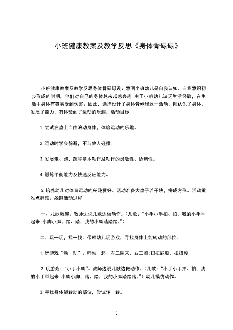 小班健康教案及教学反思身体骨碌碌设计意图小班幼儿是自我认知、自我意识初步形成的时期,他们对自己的身体越来越感兴趣;由于小班幼儿缺乏生活经验,在生活中身体有容易受到伤害。因此,选择设计了身体骨碌碌这一活动,既认识了身体,发展了能力,有体验到了运动的乐趣。活动目标