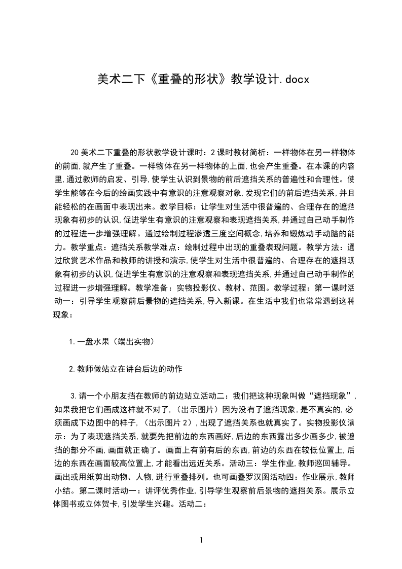 20美术二下重叠的形状教学设计课时:2课时教材简析:一样物体在另一样物体的前面,就产生了重叠。一样物体在另一样物体的上面,也会产生重叠。在本课的内容里,通过教师的启发、引导,使学生认识到景物的前后遮挡关系的普遍性和合理性。使学生能够在今后的绘画实践中有意识的注意观察对象,发现它们的前后遮挡关系,并且能轻松的在画面中表现出来。教学目标:让学生对生活中很普遍的、合理存在的遮挡现象有初步的认识,促进学生有意识的注意观察和表现遮挡关系,并通过自己动手制作的过程进一步增强理解。通过绘制过程渗透三度空间概念,培养和锻炼动手动脑的能力。教学重点:遮挡关系教学难点:绘制过程中出现的重叠表现问题。教学方法:通过欣赏艺术作品和教师的讲授和演示,使学生对生活中很普遍的、合理存在的遮挡现象有初步的认识,促进学生有意识的注意观察和表现遮挡关系,并通过自己动手制作的过程进一步增强理解。教学准备:实物投影仪、教材、范图。教学过程:第一课时活动一:引导学生观察前后景物的遮挡关系,导入新课。在生活中我们也常常遇到这种现象: