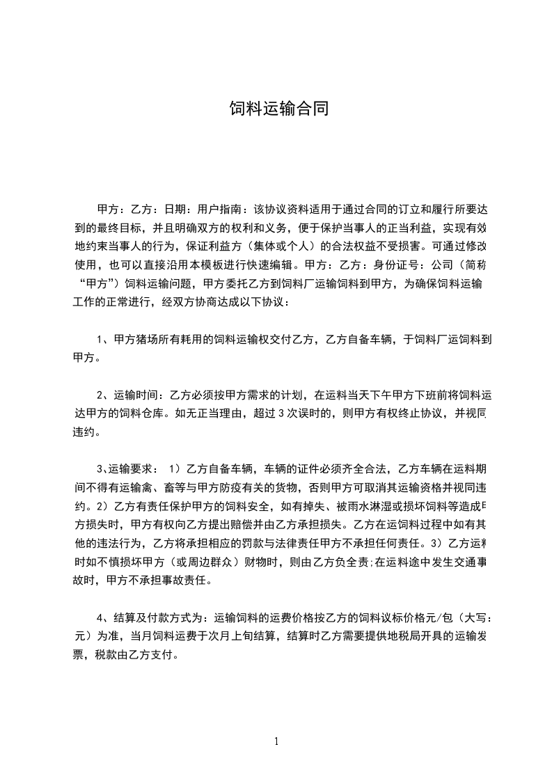 甲方:乙方:日期:用户指南:该协议资料适用于通过合同的订立和履行所要达到的最终目标,并且明确双方的权利和义务,便于保护当事人的正当利益,实现有效地约束当事人的行为,保证利益方(集体或个人)的合法权益不受损害。可通过修改使用,也可以直接沿用本模板进行快速编辑。甲方:乙方:身份证号:公司(简称“甲方”)饲料运输问题,甲方委托乙方到饲料厂运输饲料到甲方,为确保饲料运输工作的正常进行,经双方协商达成以下协议: