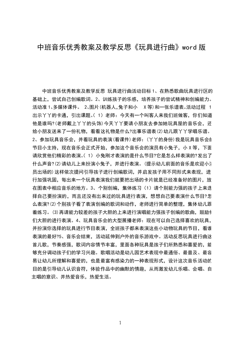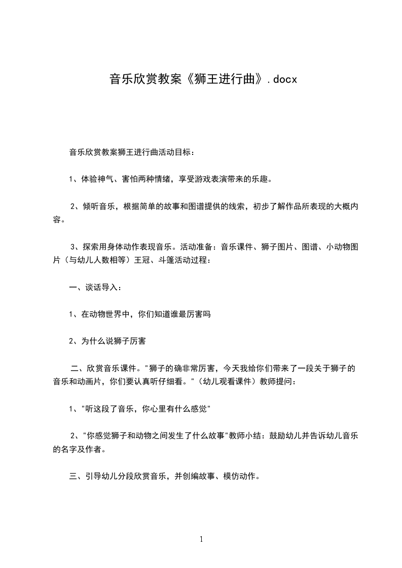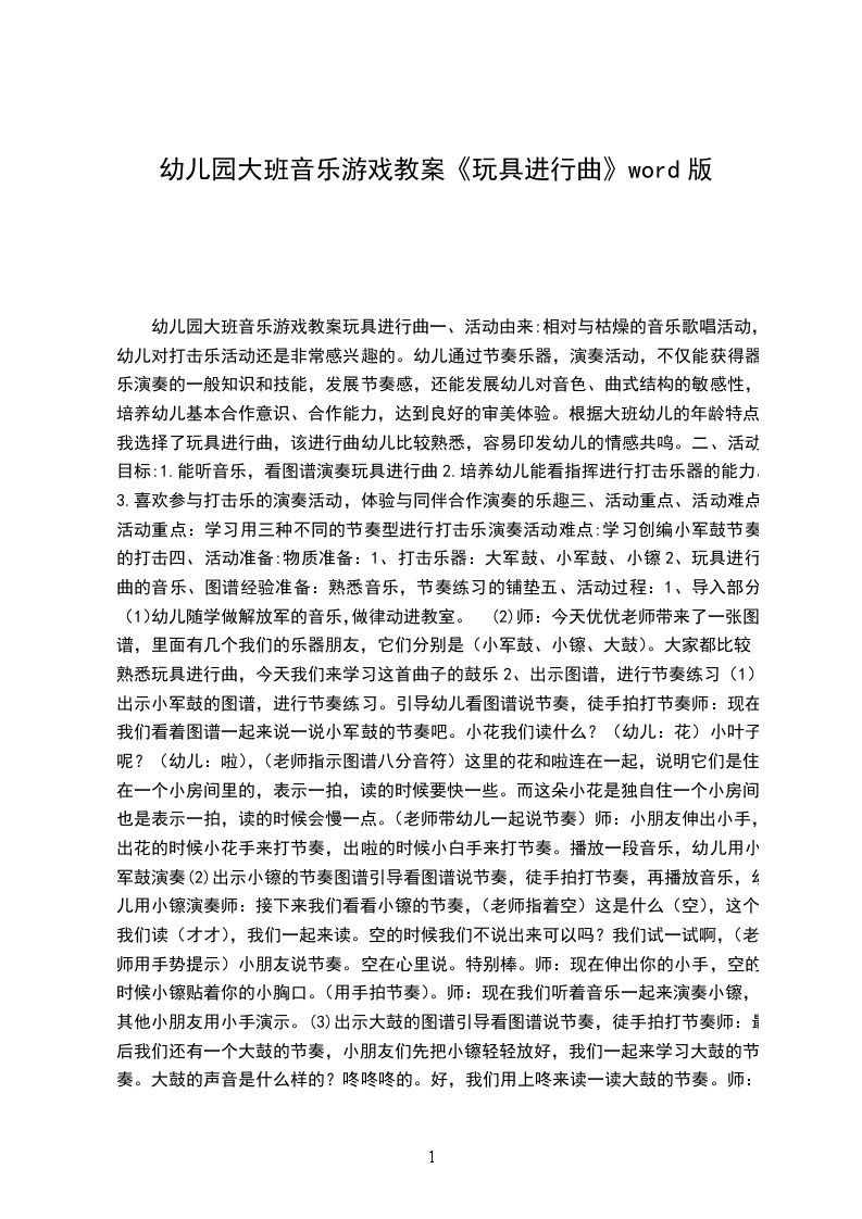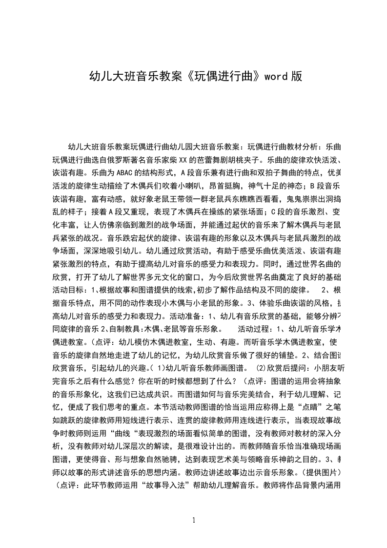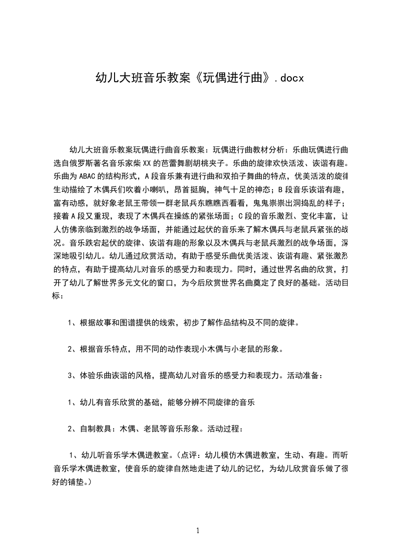 幼儿大班音乐教案玩偶进行曲音乐教案:玩偶进行曲教材分析:乐曲玩偶进行曲选自俄罗斯著名音乐家柴XX的芭蕾舞剧胡桃夹子。乐曲的旋律欢快活泼、诙谐有趣。乐曲为ABAC的结构形式,A段音乐兼有进行曲和双拍子舞曲的特点,优美活泼的旋律生动描绘了木偶兵们吹着小喇叭,昂首挺胸,神气十足的神态;B段音乐诙谐有趣,富有动感,就好象老鼠王带领一群老鼠兵东瞧瞧西看看,鬼鬼祟祟出洞捣乱的样子;接着A段又重现,表现了木偶兵在操练的紧张场面;C段的音乐激烈、变化丰富,让人仿佛亲临到激烈的战争场面,并能通过起伏的音乐来了解木偶兵与老鼠兵紧张的战况。音乐跌宕起伏的旋律、诙谐有趣的形象以及木偶兵与老鼠兵激烈的战争场面,深深地吸引幼儿。幼儿通过欣赏活动,有助于感受乐曲优美活泼、诙谐有趣、紧张激烈的特点,有助于提高幼儿对音乐的感受力和表现力。同时,通过世界名曲的欣赏,打开了幼儿了解世界多元文化的窗口,为今后欣赏世界名曲奠定了良好的基础。活动目标: