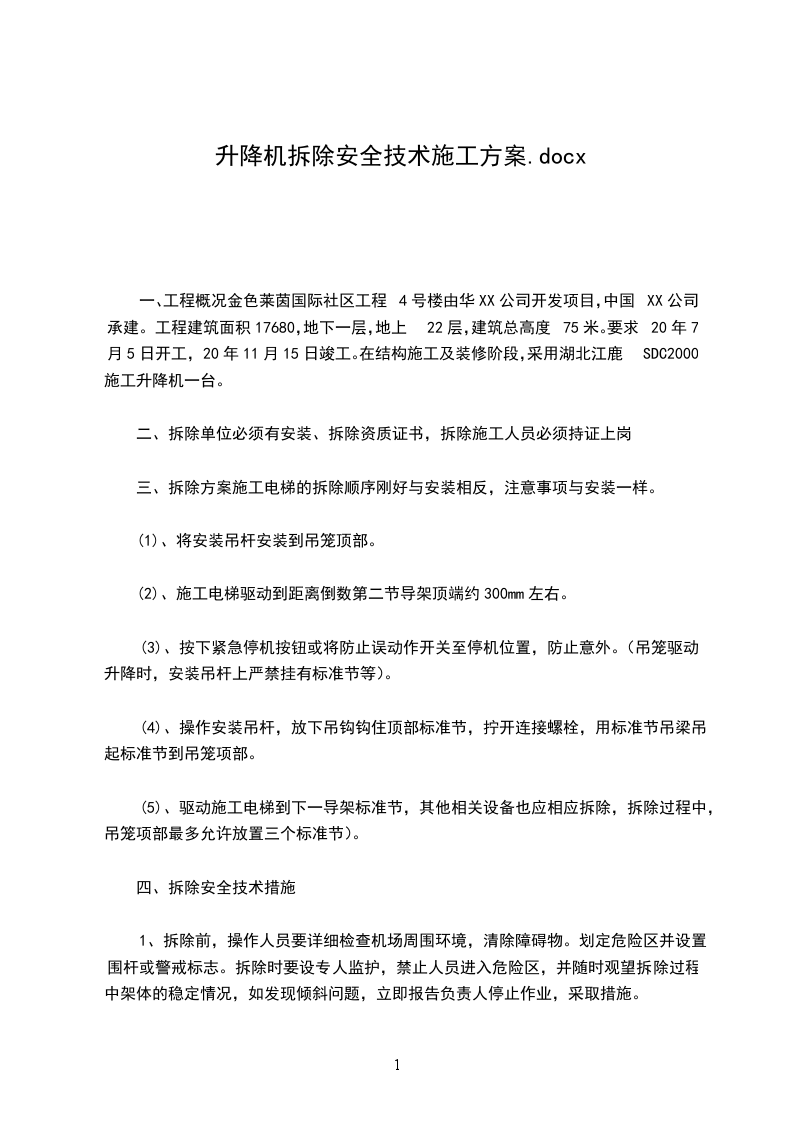 一、工程概况金色莱茵国际社区工程4号楼由华XX公司开发项目,中国XX公司承建。工程建筑面积17680,地下一层,地上22层,建筑总高度75米。要求20年7月5日开工,20年11月15日竣工。在结构施工及装修阶段,采用湖北江鹿SDC2000施工升降机一台。