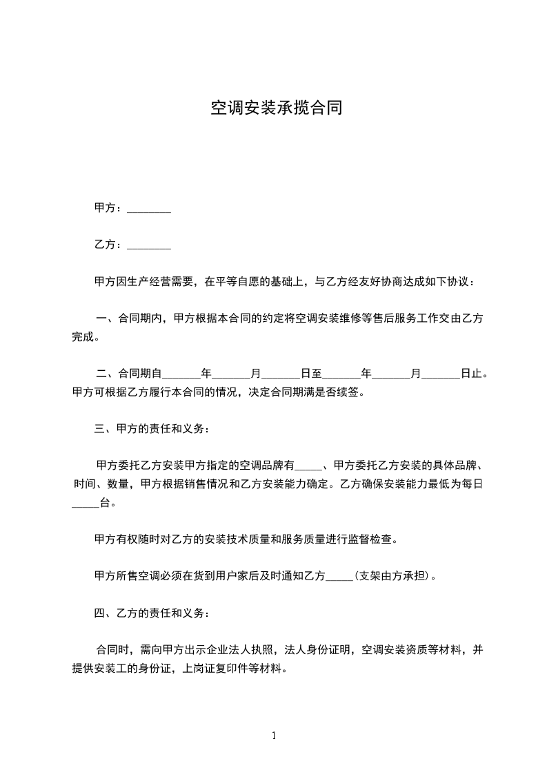 甲方委托乙方安装甲方指定的空调品牌有_____、甲方委托乙方安装的具体品牌、时间、数量,甲方根据销售情况和乙方安装能力确定。乙方确保安装能力最低为每日_____台。