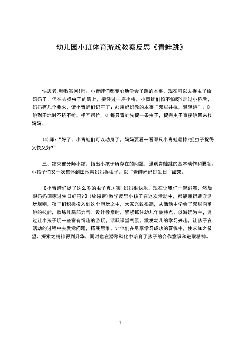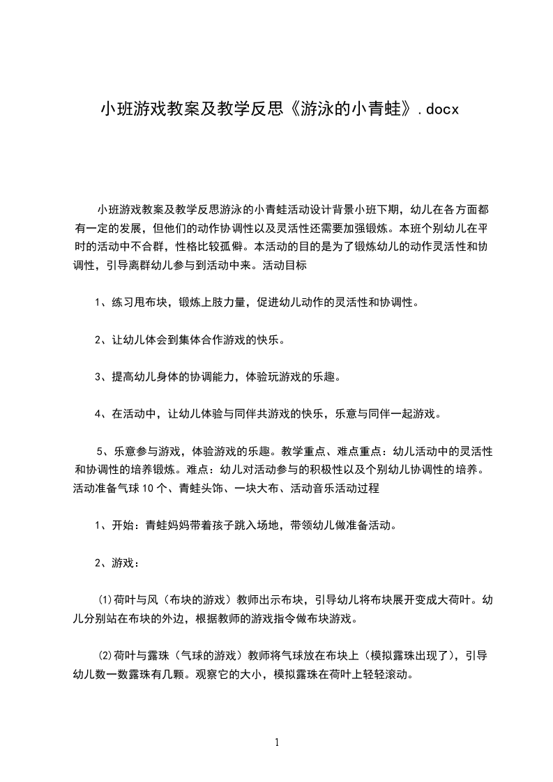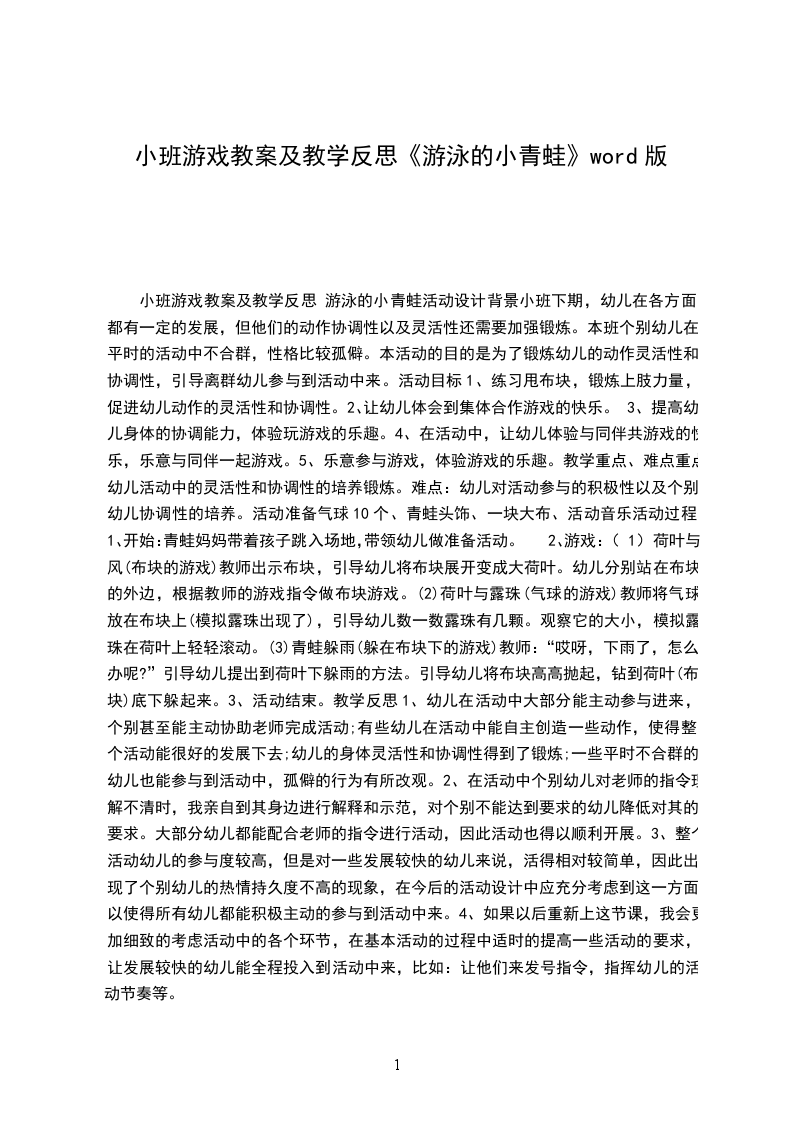 小班游戏教案及教学反思游泳的小青蛙活动设计背景小班下期,幼儿在各方面都有一定的发展,但他们的动作协调性以及灵活性还需要加强锻炼。本班个别幼儿在平时的活动中不合群,性格比较孤僻。本活动的目的是为了锻炼幼儿的动作灵活性和协调性,引导离群幼儿参与到活动中来。活动目标