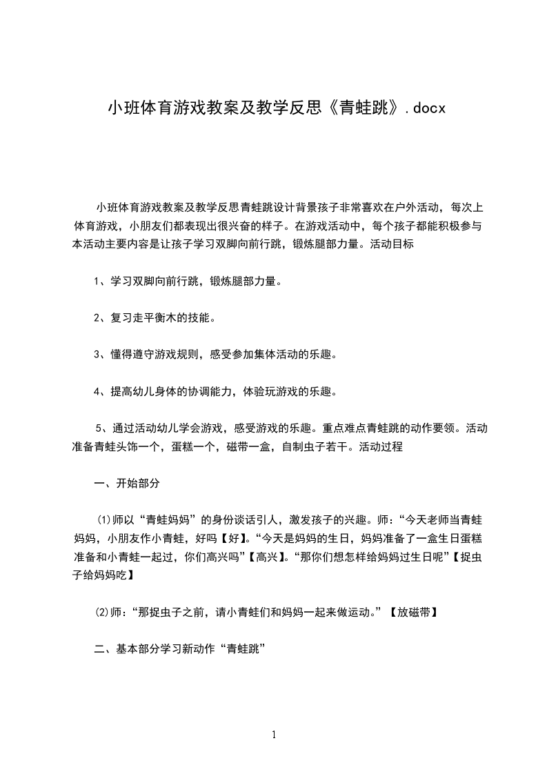 5、乐意参与游戏,体验游戏的乐趣。教学重点、难点重点:幼儿活动中的灵活性和协调性的培养锻炼。难点:幼儿对活动参与的积极性以及个别幼儿协调性的培养。活动准备气球10个、青蛙头饰、一块大布、活动音乐活动过程