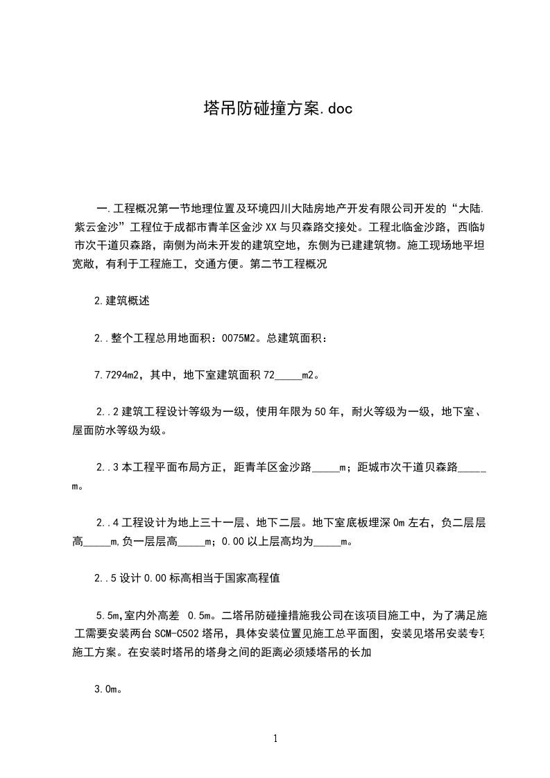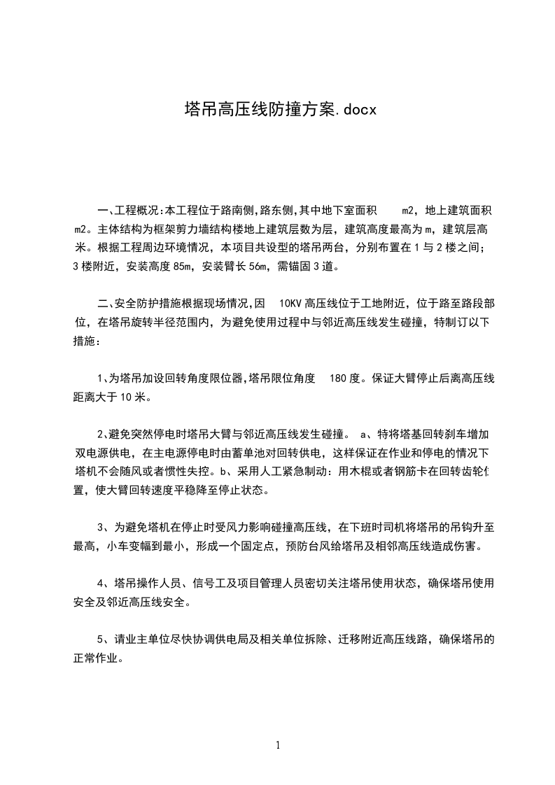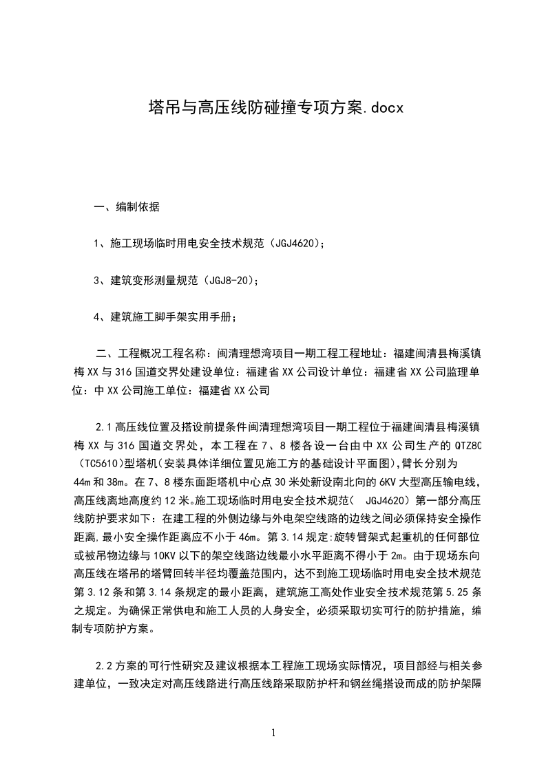 2.1高压线位置及搭设前提条件闽清理想湾项目一期工程位于福建闽清县梅溪镇梅XX与316国道交界处,本工程在7、8楼各设一台由中XX公司生产的QTZ80(TC5610)型塔机(安装具体详细位置见施工方的基础设计平面图),臂长分别为44m和38m。在7、8楼东面距塔机中心点30米处新设南北向的6KV大型高压输电线,高压线离地高度约12米。施工现场临时用电安全技术规范(JGJ4620)第一部分高压线防护要求如下:在建工程的外侧边缘与外电架空线路的边线之间必须保持安全操作距离,最小安全操作距离应不小于46m。第3.14规定:旋转臂架式起重机的任何部位或被吊物边缘与10KV以下的架空线路边线最小水平距离不得小于2m。由于现场东向高压线在塔吊的塔臂回转半径均覆盖范围内,达不到施工现场临时用电安全技术规范第3.12条和第3.14条规定的最小距离,建筑施工高处作业安全技术规范第5.25条之规定。为确保正常供电和施工人员的人身安全,必须采取切实可行的防护措施,编制专项防护方案。