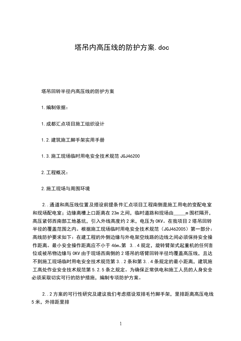 2.2方案的可行性研究及建议根据本工程施工现场实际情况,项目部经与相关参建单位,一致决定对高压线路进行高压线路采取防护杆和钢丝绳搭设而成的防护架隔离措施,并悬挂醒目的警告标志。为确保正常供电和施工人员的人身安全,必须采取切实可行的防护措施,编制专项防护方案。
