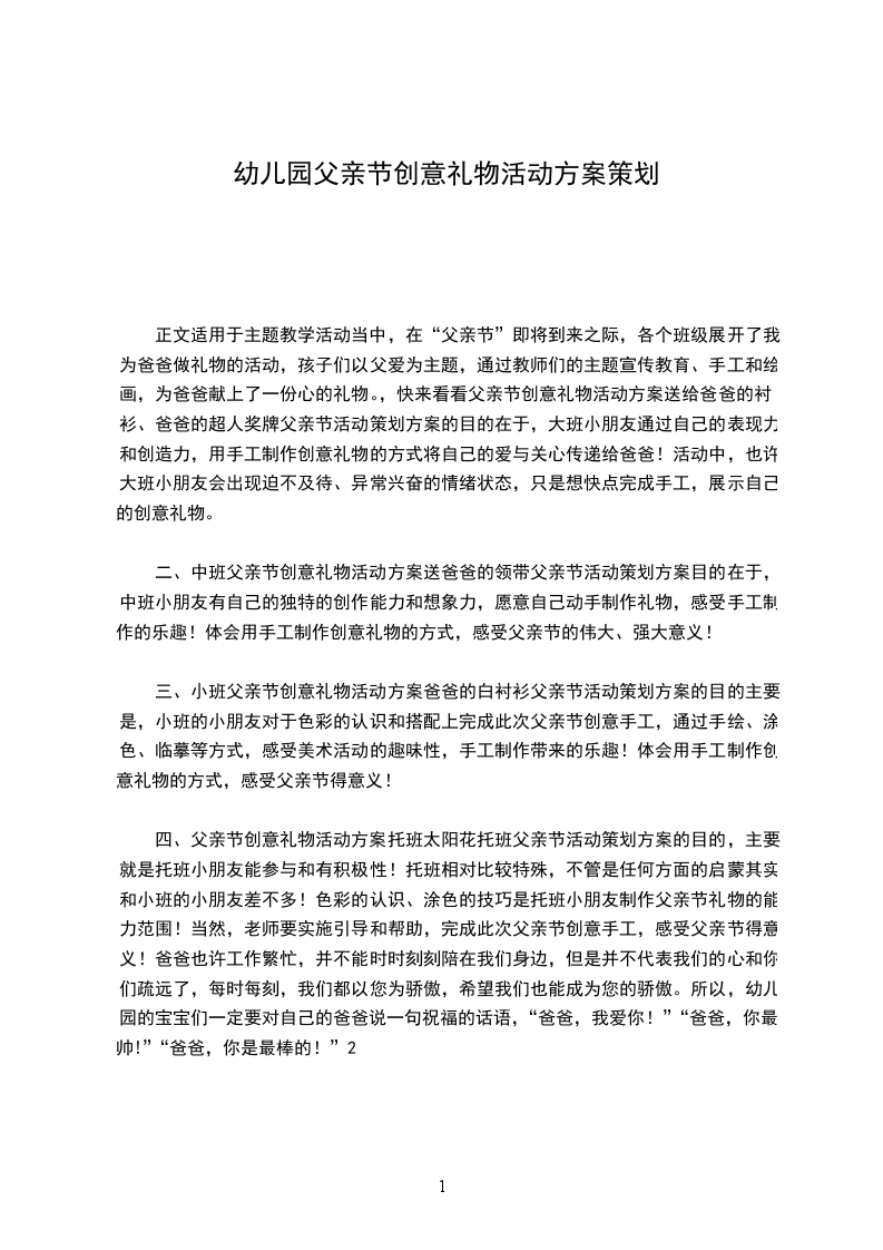 四、父亲节创意礼物活动方案托班太阳花托班父亲节活动策划方案的目的,主要就是托班小朋友能参与和有积极性!托班相对比较特殊,不管是任何方面的启蒙其实和小班的小朋友差不多!色彩的认识、涂色的技巧是托班小朋友制作父亲节礼物的能力范围!当然,老师要实施引导和帮助,完成此次父亲节创意手工,感受父亲节得意义!爸爸也许工作繁忙,并不能时时刻刻陪在我们身边,但是并不代表我们的心和你们疏远了,每时每刻,我们都以您为骄傲,希望我们也能成为您的骄傲。所以,幼儿园的宝宝们一定要对自己的爸爸说一句祝福的话语,“爸爸,我爱你!”“爸爸,你最帅!”“爸爸,你是最棒的!”2