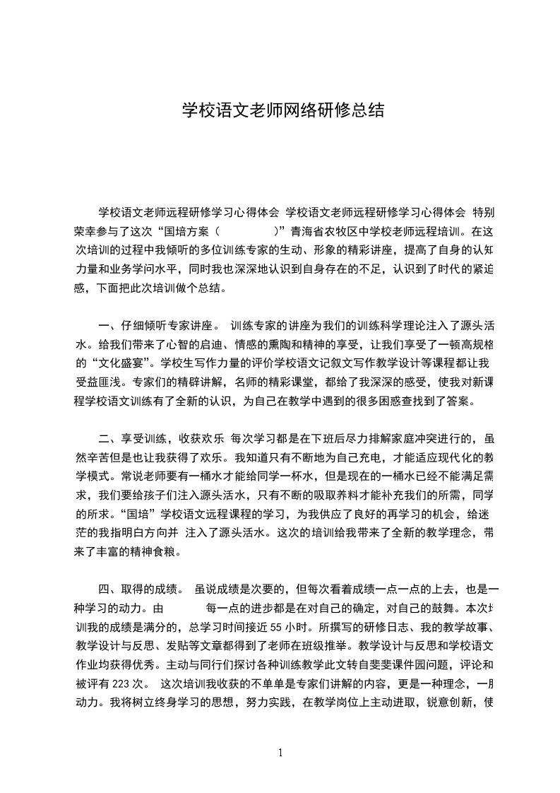 5、研修总结在年末时把近一年的研修历程,把自己在研修过程中的学习、进步和体会结合起来写一篇个人研修分析与总结。最终,盼望通过校本教研,不断提升自己,进展自己。