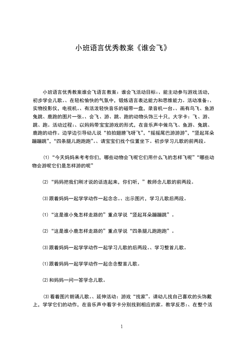 小班语言优秀教案谁会飞语言教案:谁会飞活动目标:、能主动参与游戏活动,初步学会儿歌。、在轻松愉快的气氛中,锻炼语言表达能力和思维能力。活动准备:、实物投影仪,电视机。、有活泼轻快音乐的磁带一盘,录音机一台。、画有鸟飞、鱼游、兔跳、鹿跑的图片一张。、会飞、游、跳、跑的动物头饰三十只,大字卡:飞、游、跳、跑。活动过程:、以妈妈带宝宝游戏的形式,在音乐声中做鸟飞、鱼游、兔跳、鹿跑的动作。边学边引导幼儿说“拍拍翅膀飞呀飞”,“摇摇尾巴游游游”,“竖起耳朵蹦蹦跳”,“四条腿儿跑跑跑”。、请宝宝们找个位置坐下。初步学习儿歌的前两段。