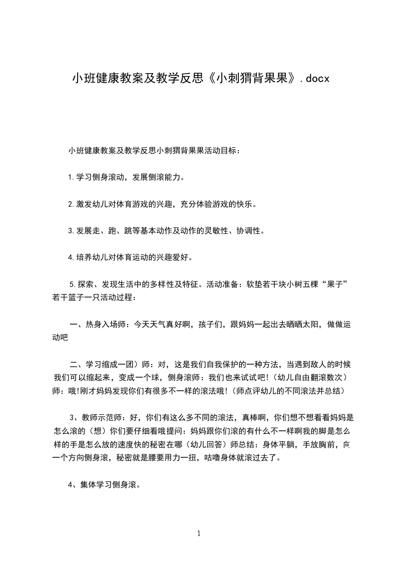 四、放松活动师:瞧!我们背了这么多的果子,真开心啊。都累了吧,那我们一起来放松一下吧。师:我们带着果子一个跟着一个回家罗!活动反思:整个活动遵循了幼儿的年龄特点,以游戏的方式贯穿于始终,让幼儿在愉快轻松地游戏中促进动作发展。下面我来谈谈这次教研活动的研讨过程。第一次我们听了苏XX的试教。课后我们下午班老师对这节课的讨论非常激烈,老师们一致认为本节课在内容设计上符合幼儿年龄特点,整节课幼儿气氛活跃,积极性高。但也存在一些问题,在最后爬过树林,钻山洞环节中,起先我们设计的目标是让孩子复习巩固钻,孩子们爬到山洞就堵在一起,也没有按照钻的要求去钻,出现这种情况,我们又在讨论,是继续还是去掉这个环节,最后讨论结果还是按照原来的环节开展活动。第二次我在试教中同样也出现了这种现象,我们找原因,环节本身出现问题,让孩子在快速爬的时候去钻,他们难以控制,就不可能达到我们所定的教学要求,最后还是去掉了这个环节。另外一个环节,让孩子学会侧身滚,身体躺平,脚伸直,两手放胸前,也是这节课的重点。大部分孩子都认为刺猬是缩起来滚的。对于这种概念。我们也查了很多资料。到底刺猬滚得时候是缩起来滚吗答案是;有时候会缩起来滚,有时候脚伸直滚,所以我们让孩子在尝试滚的时候让孩子去告诉大家你是怎么滚,最后教师点评告诉孩子今天刺猬妈妈教你们新的本领滚-侧身滚