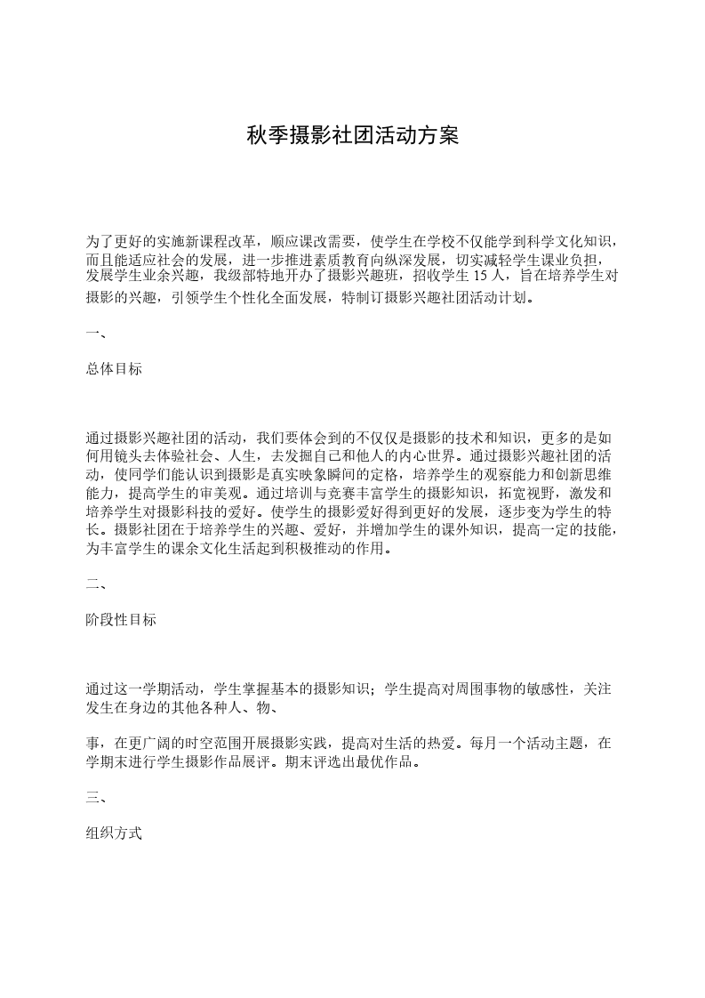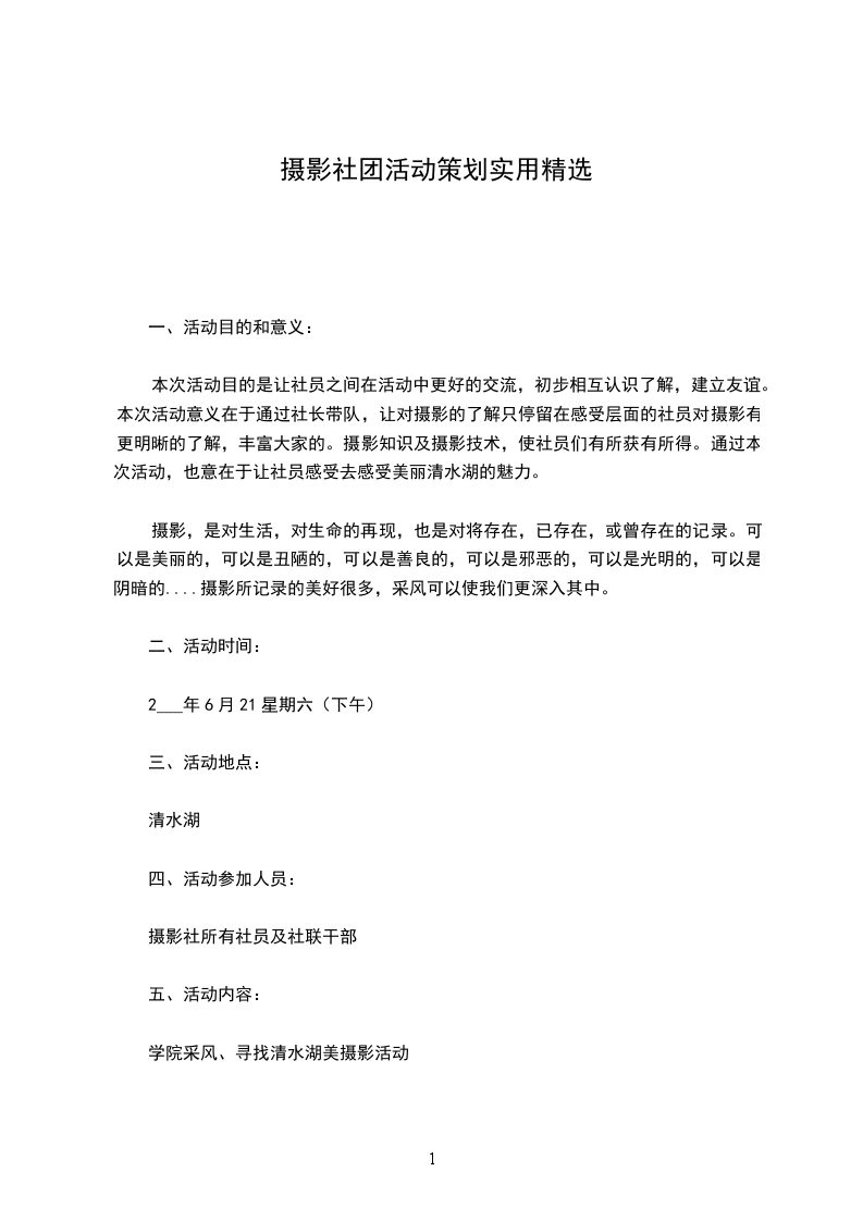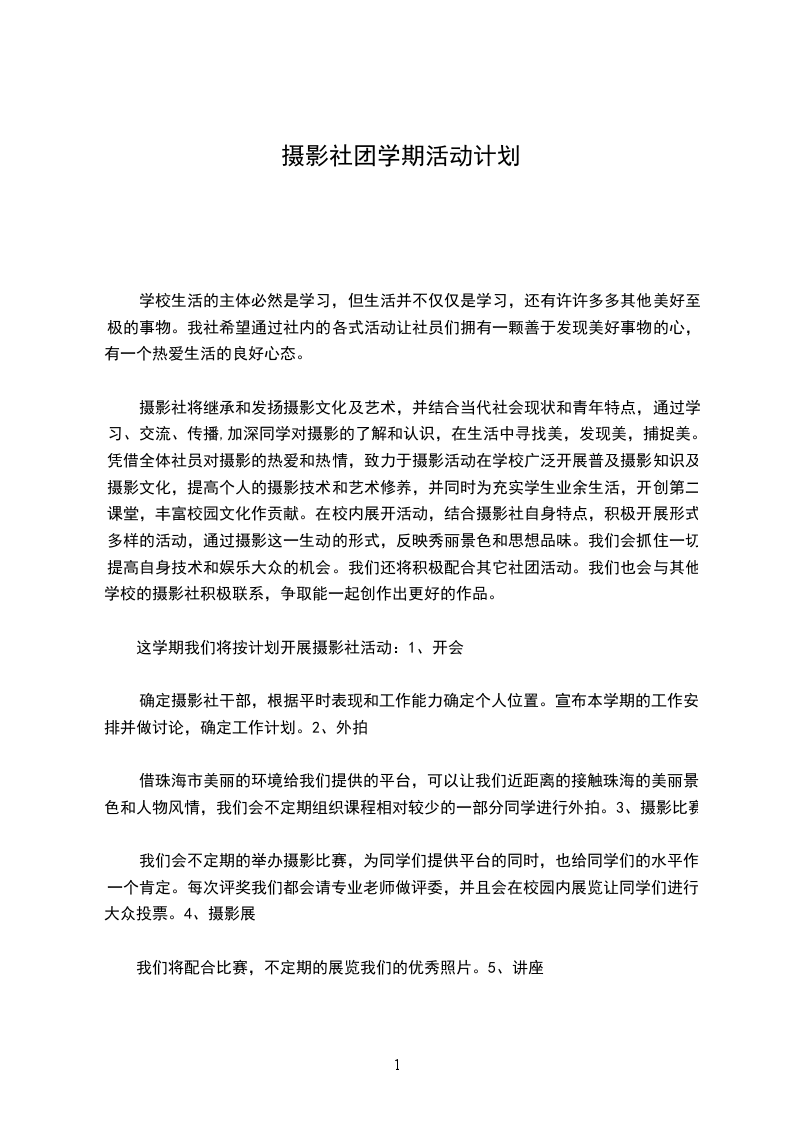 一、活动目的:本学期开设的摄影社团为一部分有特长爱好的学生提供一个展示个性才艺的机会和空间,使他们的一技之长得到充分的发挥和展示,以点带面,促进全校的摄影活动。进一步了解摄影的基本知识,掌握摄影的技能技巧,提高学生鉴赏美及创造美的能力。同时让学生在活动中体验摄影的乐趣。