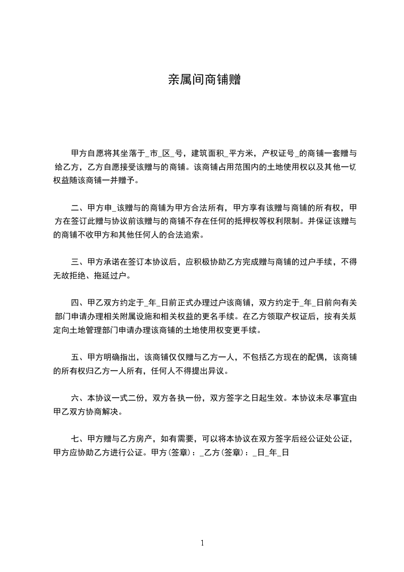甲方自愿将其坐落于_市_区_号,建筑面积_平方米,产权证号_的商铺一套赠与给乙方,乙方自愿接受该赠与的商铺。该商铺占用范围内的土地使用权以及其他一切权益随该商铺一并赠予。