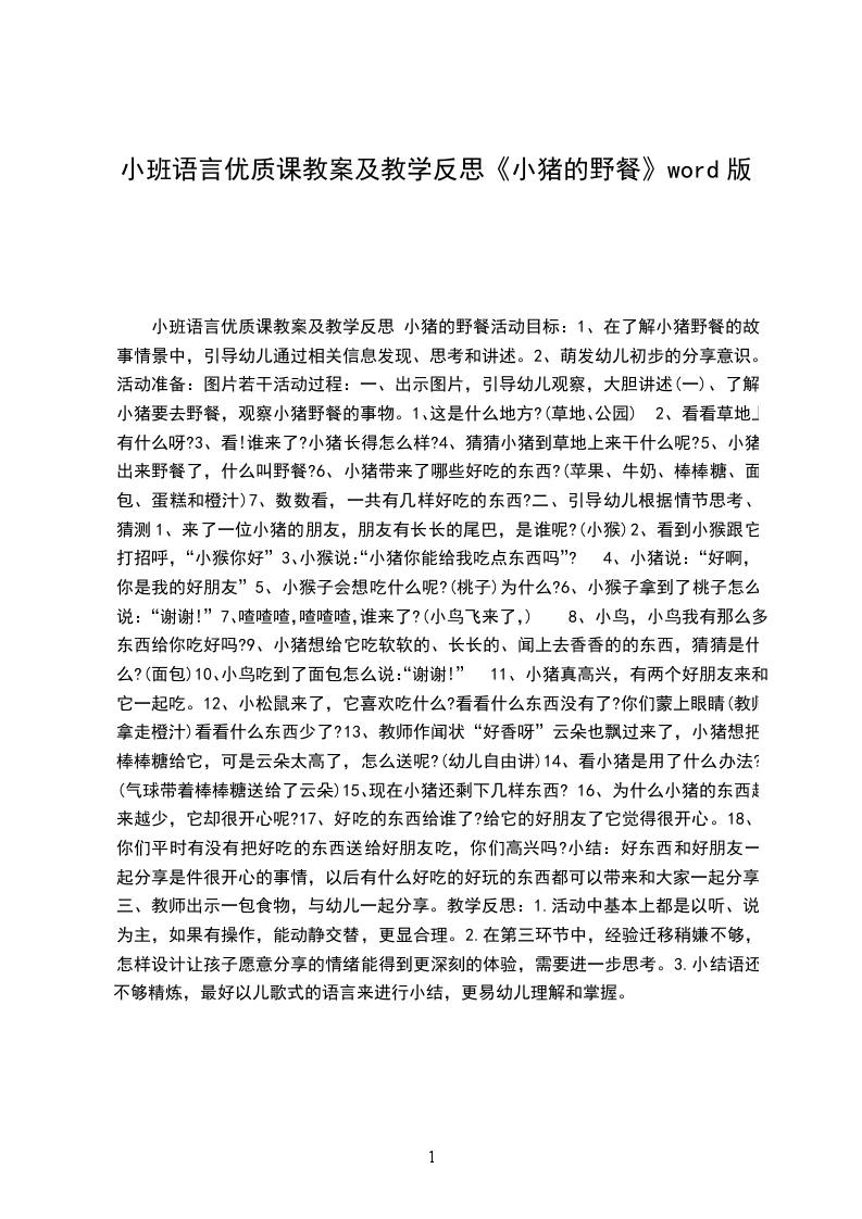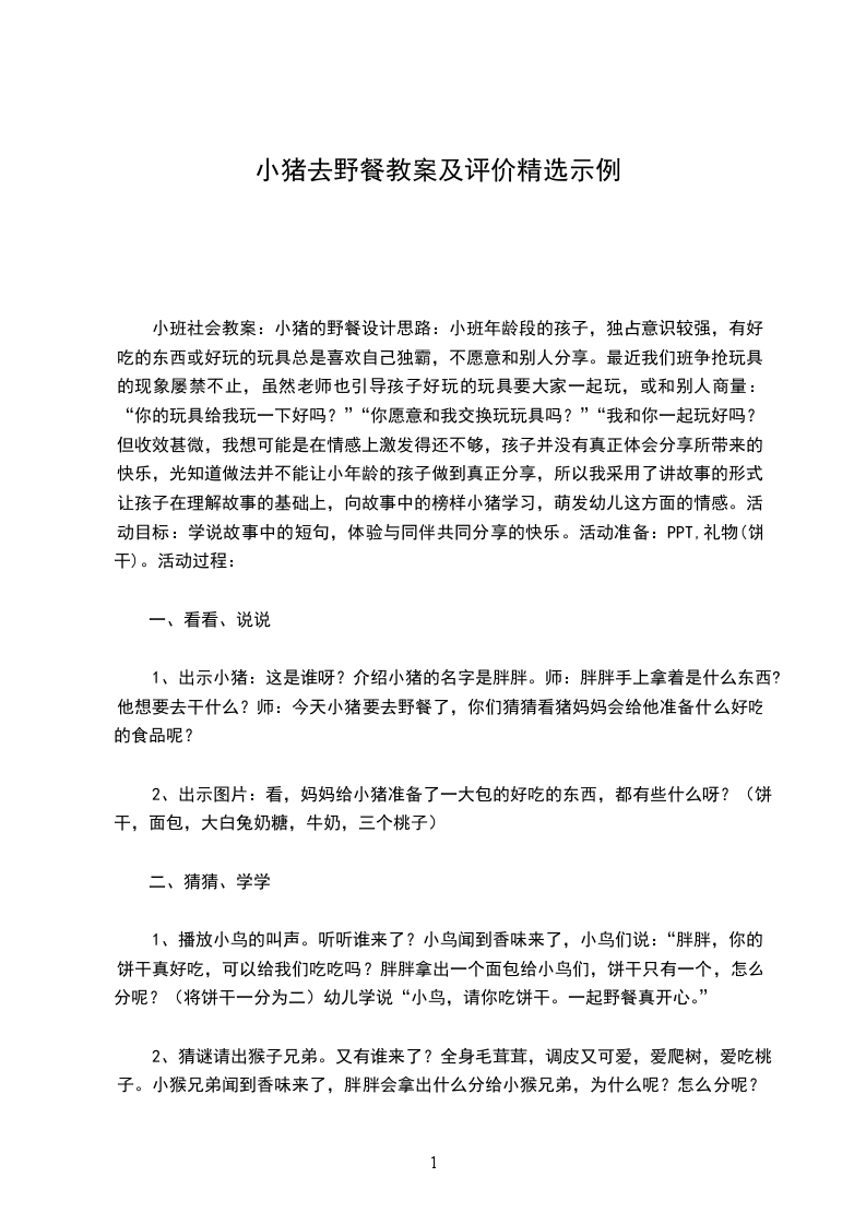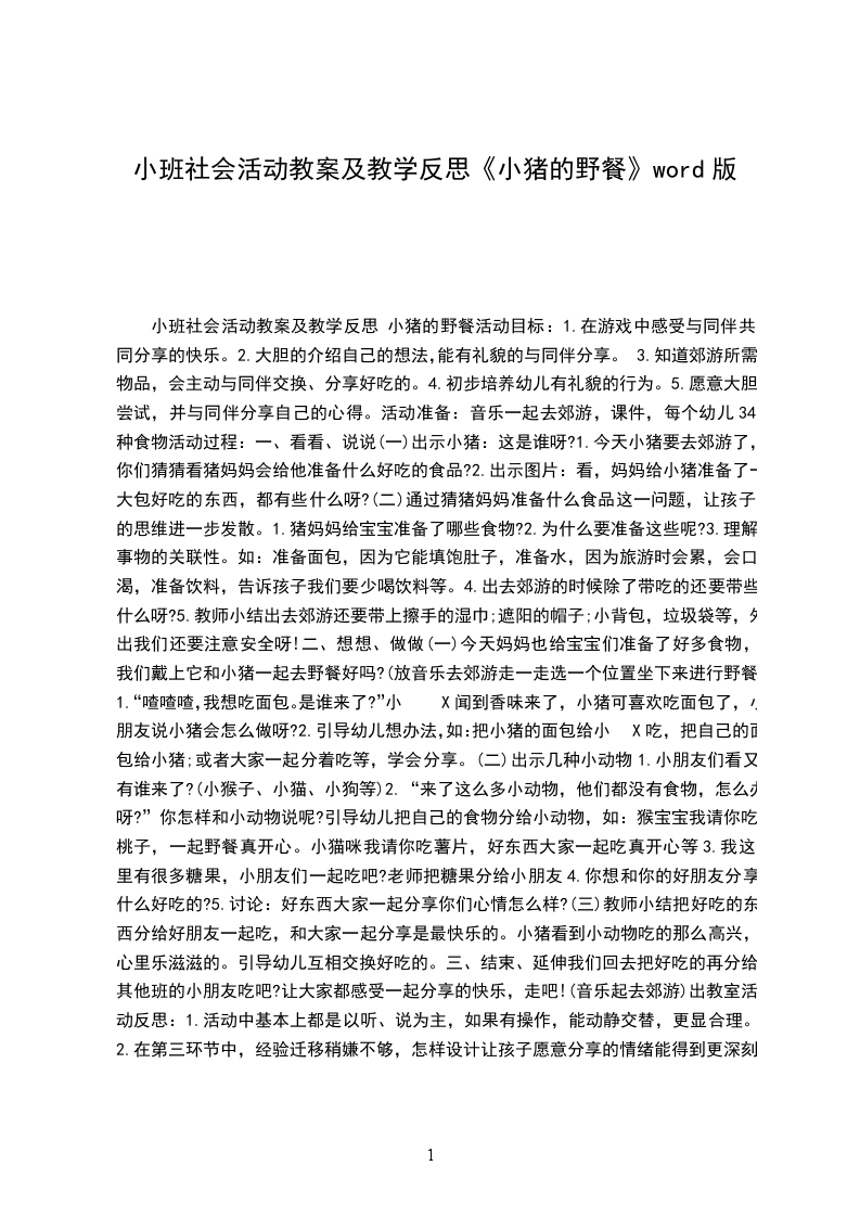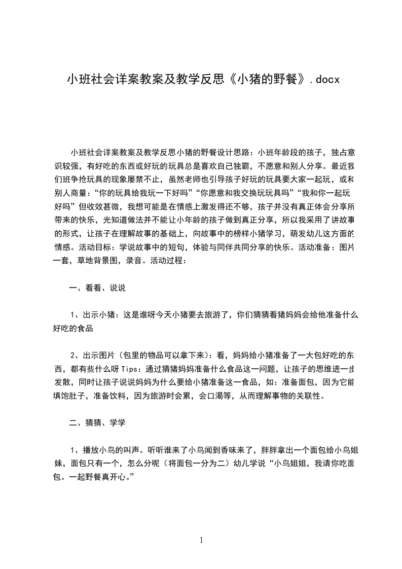 小班社会详案教案及教学反思小猪的野餐设计思路:小班年龄段的孩子,独占意识较强,有好吃的东西或好玩的玩具总是喜欢自己独霸,不愿意和别人分享。最近我们班争抢玩具的现象屡禁不止,虽然老师也引导孩子好玩的玩具要大家一起玩,或和别人商量:“你的玩具给我玩一下好吗”“你愿意和我交换玩玩具吗”“我和你一起玩好吗”但收效甚微,我想可能是在情感上激发得还不够,孩子并没有真正体会分享所带来的快乐,光知道做法并不能让小年龄的孩子做到真正分享,所以我采用了讲故事的形式,让孩子在理解故事的基础上,向故事中的榜样小猪学习,萌发幼儿这方面的情感。活动目标:学说故事中的短句,体验与同伴共同分享的快乐。活动准备:图片一套,草地背景图,录音。活动过程: