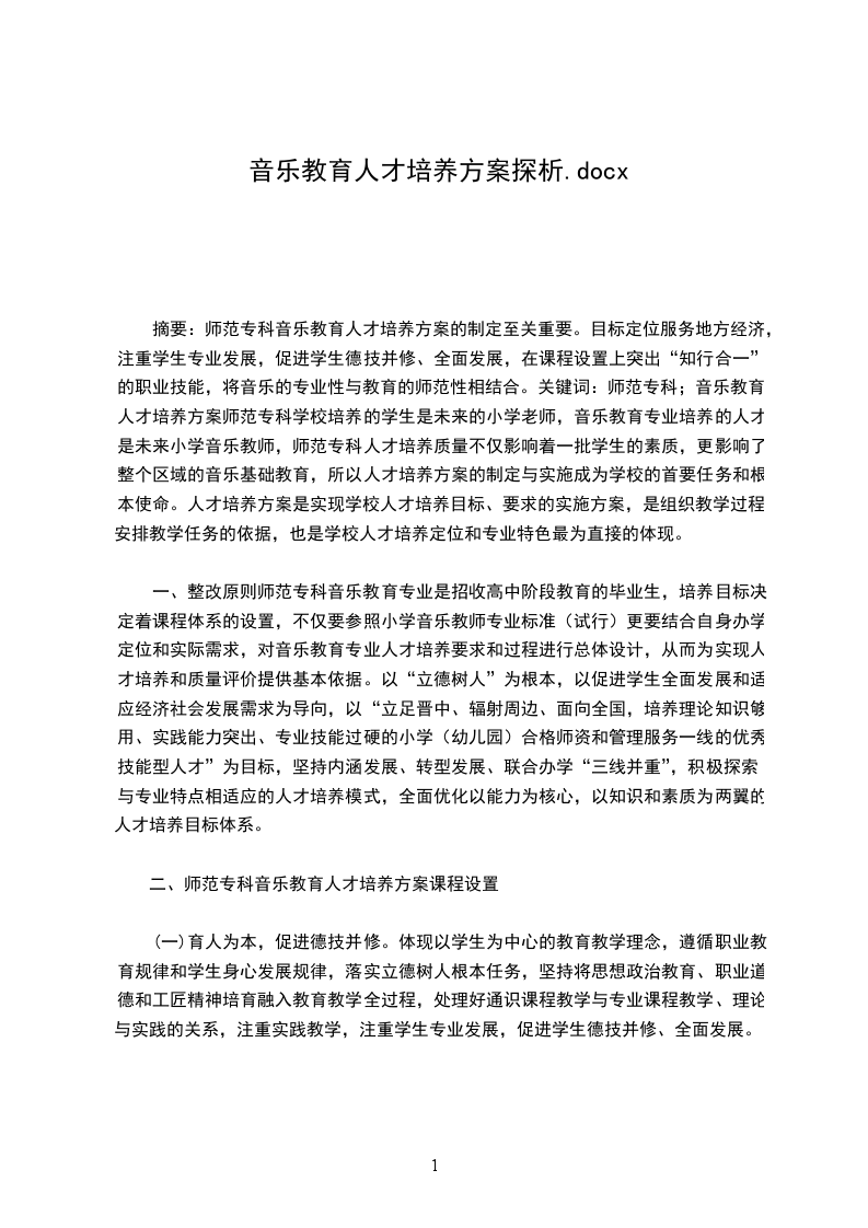 摘要:师范专科音乐教育人才培养方案的制定至关重要。目标定位服务地方经济,注重学生专业发展,促进学生德技并修、全面发展,在课程设置上突出“知行合一”的职业技能,将音乐的专业性与教育的师范性相结合。关键词:师范专科;音乐教育;人才培养方案师范专科学校培养的学生是未来的小学老师,音乐教育专业培养的人才是未来小学音乐教师,师范专科人才培养质量不仅影响着一批学生的素质,更影响了整个区域的音乐基础教育,所以人才培养方案的制定与实施成为学校的首要任务和根本使命。人才培养方案是实现学校人才培养目标、要求的实施方案,是组织教学过程,安排教学任务的依据,也是学校人才培养定位和专业特色最为直接的体现。