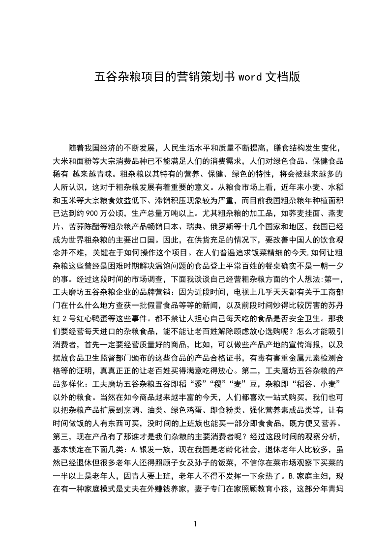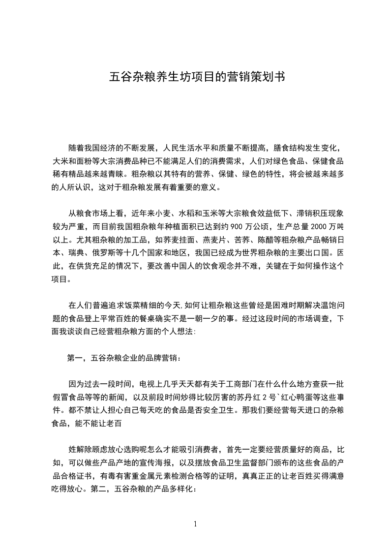 随着我国经济的不断发展,人民生活水平和质量不断提高,膳食结构发生变化,大米和面粉等大宗消费品种已不能满足人们的消费需求,人们对绿色食品、保健食品、稀有越来越青睐。粗杂粮以其特有的营养、保健、绿色的特性,将会被越来越多的人所认识,这对于粗杂粮发展有着重要的意义。从粮食市场上看,近年来小麦、水稻和玉米等大宗粮食效益低下、滞销积压现象较为严重,而目前我国粗杂粮年种植面积已达到约900万公顷,生产总量2000万吨以上。尤其粗杂粮的加工品,如荞麦挂面、燕麦片、苦荞陈醋等粗杂粮产品畅销日本、瑞典、俄罗斯等十几个国家和地区,我国已经成为世界粗杂粮的主要出口国。因此,在供货充足的情况下,要改善中国人的饮食观念并不难,关键在于如何操作这个项目。在人们普遍追求饭菜精细的今天,如何让粗杂粮这些曾经是困难时期解决温饱问题的食品登上平常百姓的餐桌确实不是一朝一夕的事。经过这段时间的市场调查,而我们配备的销售员可以把产品特性讲解得很透,比如什么人宜吃什么人不宜吃,老人要怎么吃,小孩怎么吃,糖尿病该吃什么,高血压又该怎么吃,不同的人推荐不同的产品,做到因人推销,使客户听得明白,买后使用得恰当。D.特色销售一般我们进超市买杂粮产品,象什么玉米粉黑芝麻粉等都是已经制作好的产品,但有的老百姓心里也许会想到这里有没有掺杂其它东西呢电视里面不也有时报道辣椒里掺玉米粉然后又染色等,让人不由得开始怀疑一切。那我们是不是可以在我们的杂粮店搞现场制作呢,让顾客亲眼看见产品成形的全过程,一来有亲身体验的喜悦,二来心里更放心。而且还可以根据自己的爱好需求组合不同粉类,这样不是比超市的产品更有卖点吗!E.搞好售后服务:纵观全国各行业,不管是大企业小企业,要想使企业长远发展,一是质量,二是服务。象杂粮这种经常性消费品,大多数凡是来买杂粮的都是老客户,我们可提供一些健康指标测量仪,比如体重称血压计等简单易行的设备.为老客户测量,并为其建立健康小挡案,将其测量结果一一记录,随时跟踪其健康指标。对于有慢性病的客户,还可以提供配膳服务等。F.常参加一些公益活动,提升工夫磨坊五谷杂粮企业形象。比如为学校幼儿园小区进行健康知识讲座,让更多的人认识你,还可参加到一些活动中去,例如六一儿童节,为家长和孩子提供杂粮原料,教大家做亲子互动面食等九九重阳节,为老人提供健康知识小册等,让民众切实感受到杂粮店为大家的健康做了一些实事。第五,广州工夫磨坊帮您投资五谷养生坊五谷杂粮事业成功A.工夫五谷杂粮投资行业的领先者:目前,国内现有的知名品牌有深圳XX磨房、广州工夫磨坊、安徽XX等,深圳XX磨房、安徽XX以直营为主,广州工夫磨坊以加盟为主,作为行业的领先者,工夫磨坊研发的五谷健康养生坊五谷杂粮现磨系列、五谷健康养生坊五谷杂粮成品系列、五谷健康养生坊五谷杂粮饮品系列为广大消费者提供了很好的健康保障。善瑞的产品原料来自全国各定点种植基地,保证全天然、无公害、无添加剂;工夫磨坊的配方是专家团队通过反复研究、仔细论证研发出来的组方。B.帮助投资者进行全面的选址支持:人们健康养生和消费习惯不断的建立和完善,使五谷养生事业变的前途不可限量,成为当前最有“钱”途的事业。五谷健康养生坊是你创业最好的选择,几大正确的店址选择让你顾客源源不断。