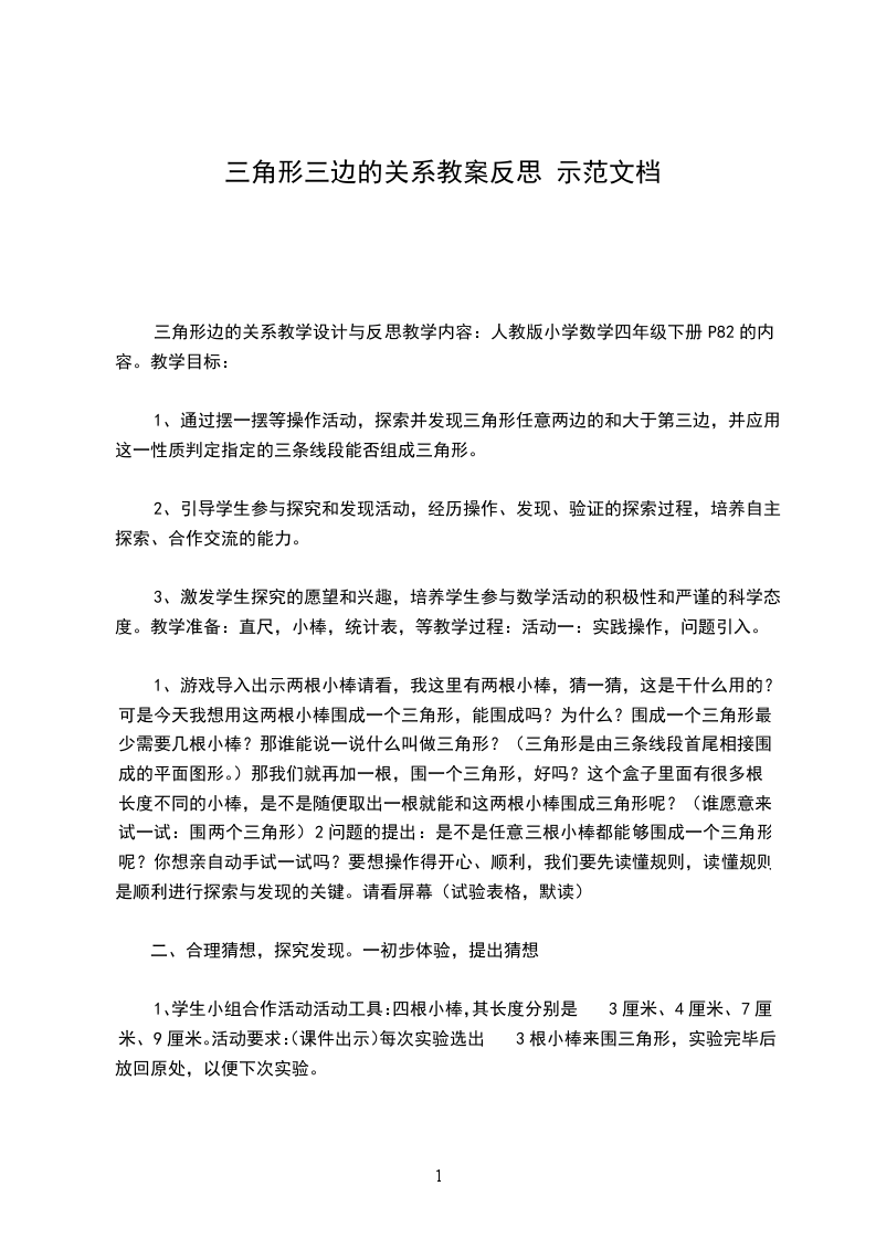 1.游戏倒入:游戏:围三角形学生取一根塑料管,并把它任意剪成三段围三角形。设计思路学生可能出现两种情况:一是有的同学围成了三角形,二是有的同学围不成三角形。当学生知道围不成三角形的原因,就能很自然的猜测到能围成三角形的条件。学生就会从前面的结论中猜想出:两条较短边之和大于最长边时可以围成三角形。是不是这样呢我们一起来动手验证一下。学生用塑料棒任意的围一个三角形,再剪成三段,比较其中较短的两根小棒之和与最长小棒的关系。再投影仪先展示围成的三角形和再展示其中两个较短小棒和最长小棒之间的关系。从而使学生得出正确结论,加深猜想的正确性。这次的围三角形,再拼三角形目的在于让学生能成功拼成三角形,并能体现三角形的任意性和多样性,再此基础上比较三边的关系,从而能让结论更具说服力。总结:两条较短边之和大于最长边就能围成三角形思考:如果两条较短边之和等于最长边时,能否围成三角形学生自己动手操作探索,用10厘米,6厘米,4厘米的小棒围三角形,可能在这一环节当中有的学生在摆的过程中由于端点没重合,或者小棒长短的误差,而且小棒是一个立体的物体,学生的观察存在一定的困难,所以摆成了三角形,教师让学生讨论,想象,实物演示,课件演示等形式让学生明白如果两条较短边之和等于最长边时,也不能围成三角形,摆成的而是两条平行线。再次总结:两条较短边之和等于最长边时,不能围成三角形,只有两条较短边之和大于最长边才能围成三角形。在得出结论的同时,让学生自己动手用所学知识做一个三角形,即能让学生所学到的知识运用到实践中,也能让学生从刚才的简单比较线段长短升华到准确的数据当中去,也为探索下个知识点做铺垫。在完成表格,小组讨论的过程中,使学生通过动手操作与分析,让学生明白三角形任意两边之和大于第三边,让学生体会到其实两条较短边之和大于最长边时,三角形的任意两边之和都大于第三边。