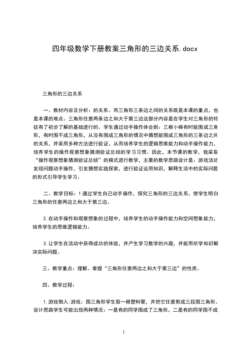 一、教材内容及分析:的关系。而三角形三条边之间的关系既是本课的重点,也是本课的难点。三角形任意两条边之和大于第三边这部分内容是在学生对三角形的特征有了初步了解的基础进行的。学生通过动手操作体会到:三根小棒有时能围成三角形,有时围不成三角形,从没有围成三角形的情况中猜想能围成三角形的三条边之间的关系,并采用多种方法进行验证。从而培养学生的逻辑思维能力和动手操作能力,培养学生的操作观察想象猜测验证总结的学习习惯。因此,本节课的教学,我采取“操作观察想象猜测验证总结”的模式进行教学,主要的教学思路设计是:游戏活动发现问题动手操作,引发猜想实践探索,进行验证运用知识,解释生活中的实际问题的形式引导学生学习。