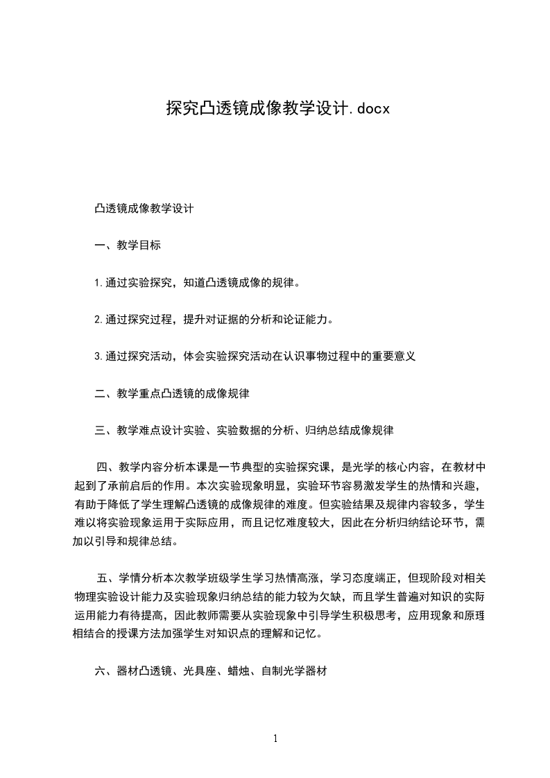 四、教学内容分析本课是一节典型的实验探究课,是光学的核心内容,在教材中起到了承前启后的作用。本次实验现象明显,实验环节容易激发学生的热情和兴趣,有助于降低了学生理解凸透镜的成像规律的难度。但实验结果及规律内容较多,学生难以将实验现象运用于实际应用,而且记忆难度较大,因此在分析归纳结论环节,需加以引导和规律总结。