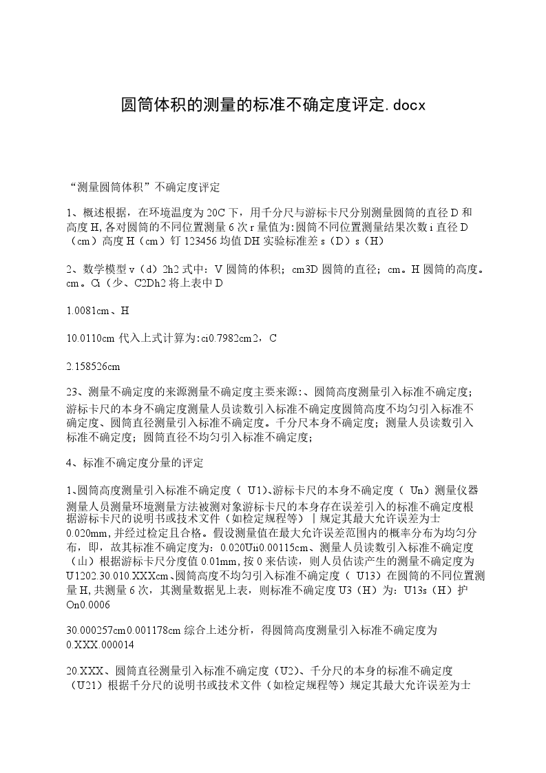 1、概述根据,在环境温度为20C下,用千分尺与游标卡尺分别测量圆筒的直径D和高度H,各对圆筒的不同位置测量6次r量值为:圆筒不同位置测量结果次数i直径D(cm)高度H(cm)钉123456均值DH实验标准差s(D)s(H)