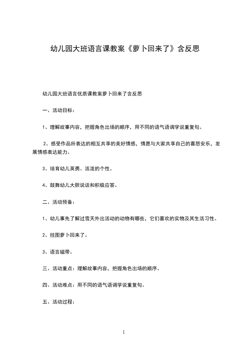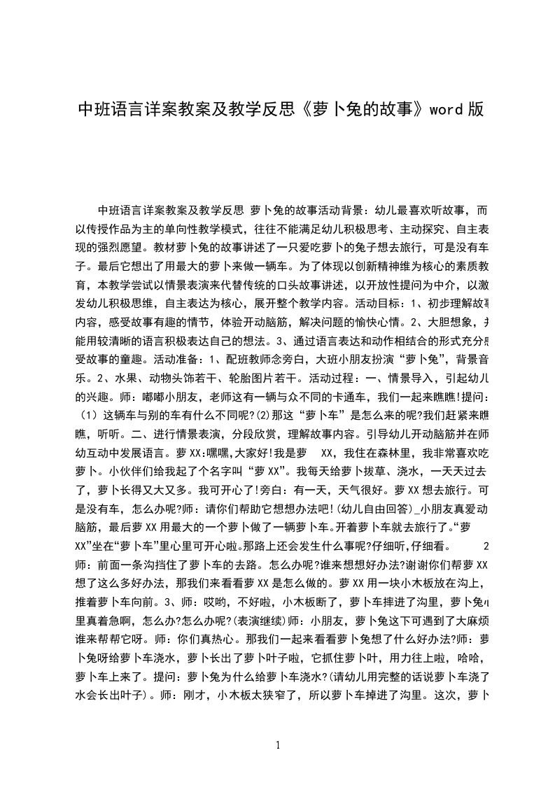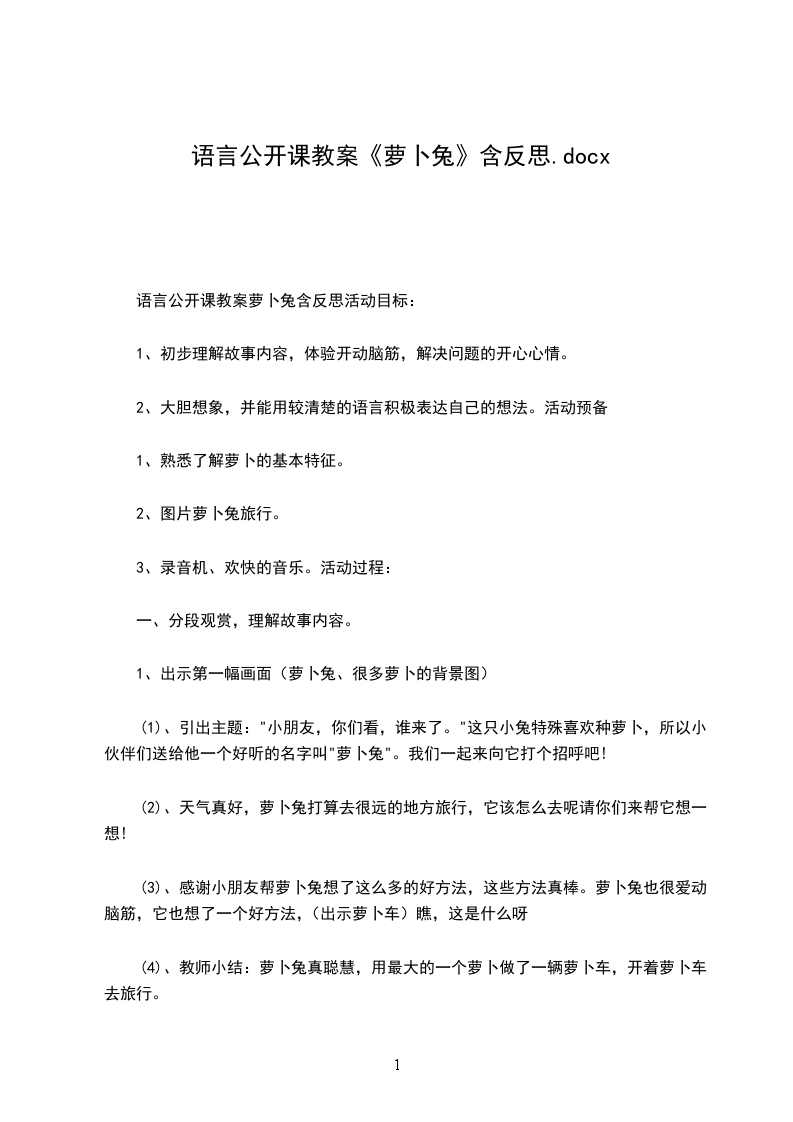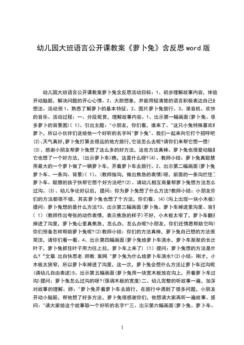三、出示第六幅画面(萝卜兔、萝卜车、干枯的花)提问:萝卜兔开着萝卜车连续旅行,路边的花向他要水喝,可是它只有萝卜车,请你们帮帮萝卜兔!怎么让花儿喝到水呢回家和爸爸妈妈一起争论、商量,明天来告知萝卜兔。森林里住着一只兔子,它特别喜欢吃萝卜。小伙伴们给它起了个名字叫"萝卜兔",萝卜兔在自家门口种了许多的萝卜。它每天给萝卜拔草、浇水,一每天过去了,萝卜长得又大又多。萝卜兔特别的快乐!有一天,天气很好。萝卜兔想去旅行。可是没有车,怎么办呢(它用最大的一个萝卜做了一辆萝卜车,开着萝卜车去旅行)突然,前面的一条沟拦住了萝卜车的去路,怎么办呢萝卜兔用一块小木版放在沟上,推着萝卜车向前。突然,听到"噶吱"一声。哎呀,不好啦。小木版断了,萝卜车掉进了沟里,萝卜兔心里真焦急,怎么办,怎么办呢有了,给萝卜车浇水,萝卜车长出叶子啦。它抓住萝卜叶,用力往上拉,哈哈,萝卜车上来了。这次萝卜兔用一块大木版放在沟上,推着萝卜车过沟了。活动反思:萝卜兔的故事叙述了一只爱吃萝卜的兔子想去旅行,可是没有车子。最终它想出了用最大的萝卜来做一辆车。故事情节生动、好玩,耐人回味。让我们体验了开动脑筋、解决问题的开心心情。以情境式表演引起幼儿兴趣,以这种叙述的形式,生动地呈现了故事情节。为帮助幼儿熟识故事内容,教师设计了层层递进式的提问,将幼儿的留意导向对故事表层信息和深层信息的感知和理解,通过生动好玩、层层递进的故事情节。调动了幼儿争论的积极性。幼儿认知得到了扩展,情感得到了培育,语言的理解力、动手操作能力得到了提高。