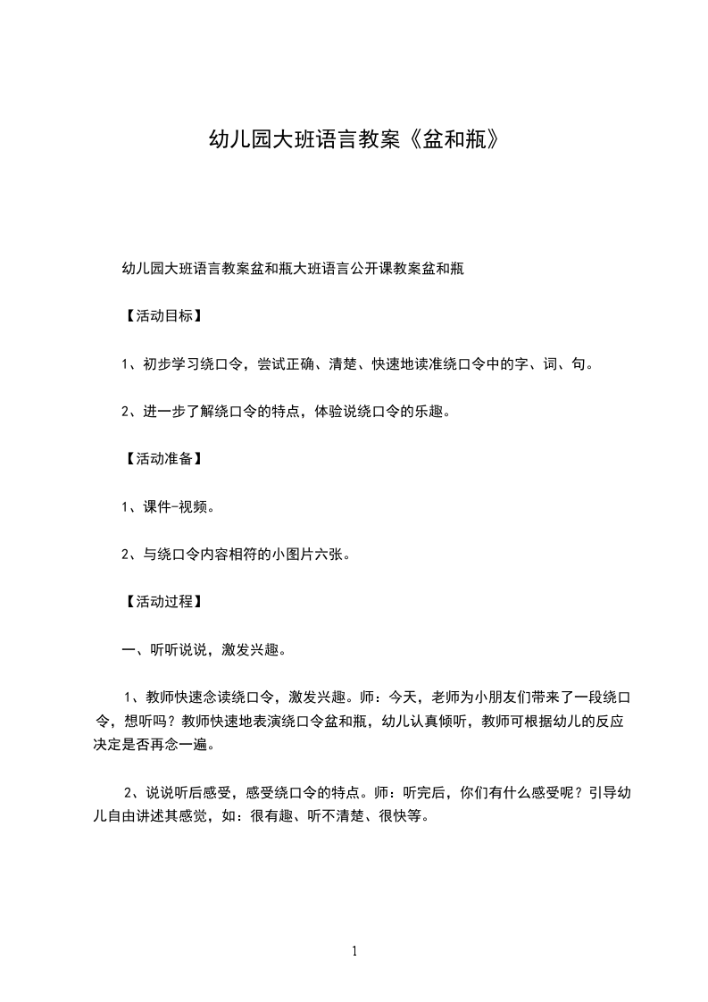 1、教师快速念读绕口令,激发兴趣。师:今天,老师为小朋友们带来了一段绕口令,想听吗?教师快速地表演绕口令盆和瓶,幼儿认真倾听,教师可根据幼儿的反应,决定是否再念一遍。