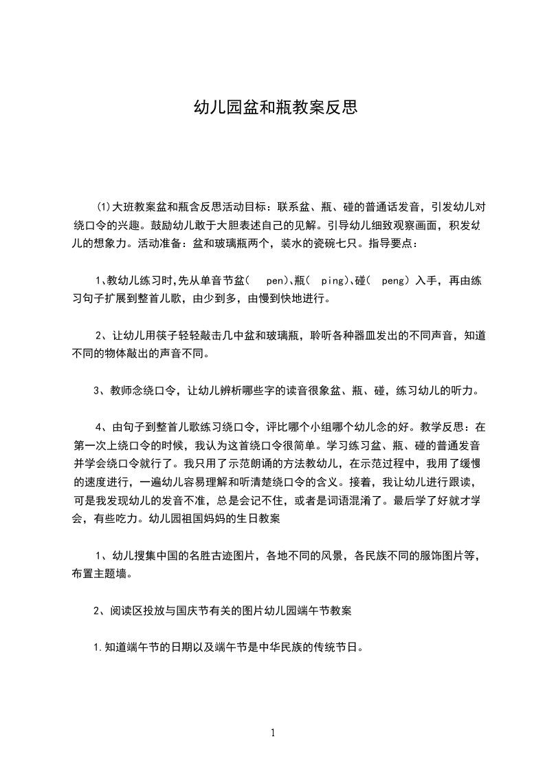 3、看看说说,学习朗诵。师:小朋友,刚才我们听到的这段绕口令的名字就叫盆和瓶,现在老师来完整地念一遍,你们可跟着一起来念一念。教师边念边根据绕口令的前后顺序,排好图片,然后引导幼儿看着图片,慢速念读绕口令,注意读准每个字音。可以以集体、分男女等形式,帮助幼儿反复练习、念读,掌握绕口令的内容。