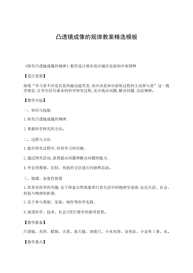 一、课前知识准备.什么叫凸透镜什么叫凹透镜利用太阳光怎样测量凸透镜的焦距(答案:中间厚、边缘薄的叫凸透镜;中间薄、边缘厚的叫凹透镜。将凸透镜正对着太阳光,再把一张纸放在它的另一侧,来回移动,让纸上的光斑变得最小,最亮为止.测量这个最小、最亮的光斑到凸透镜的距离即为焦距。).把物体置于凸透镜主光轴上距透镜,透镜的焦距为,则物体通过透镜成的像是立的像.若将物体向透镜方向移动了,则物体的像将向方向移动,同时像变为立的像.(答案:倒、缩小、实、远离透镜、倒、放大、实)