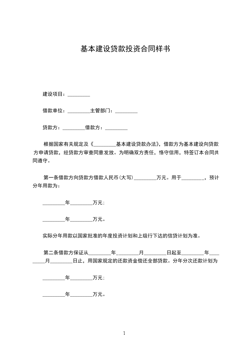 根据国家有关规定及《_________基本建设贷款办法》,借款方为基本建设向贷款方申请贷款,经贷款方审查同意发放。为明确双方责任,恪守信用,特签订本合同共同遵守。