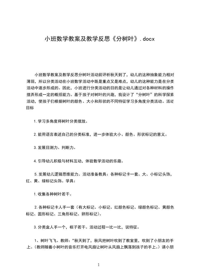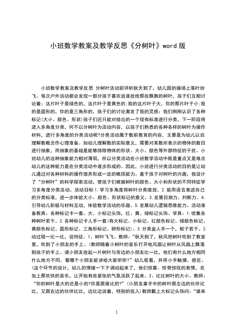(1)小班数学活动教案树叶分类含反思