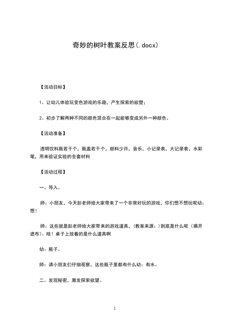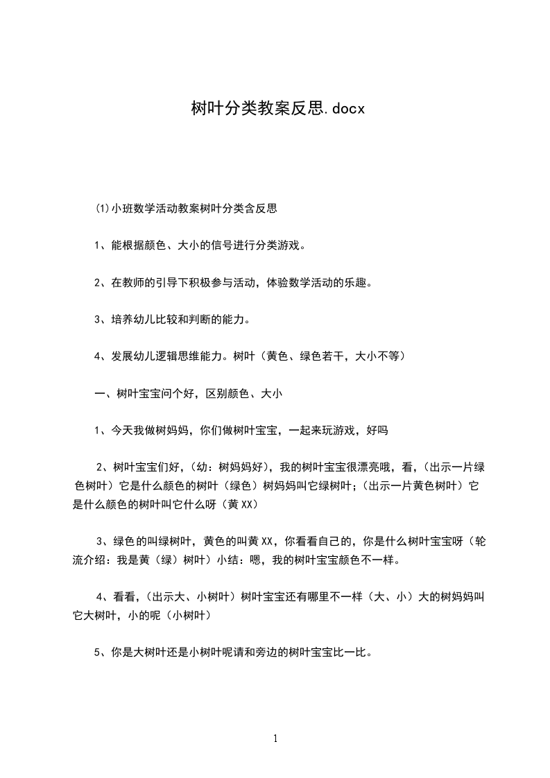 4、幼儿操作、讲评分类作为一种基本的数学思想方法,在幼儿的数学学习活动中,有着非常重要的作用。本次教学活动以游戏情境贯穿始终,适合小班年龄特点。第一环节以情境谈话导入活动,“我是树妈妈,小朋友做树叶宝X,我们一起玩游戏,让孩子在感知颜色的基础上,进行自我介绍“我是绿(黄)树叶”;再从大小不同,将树叶宝X分成大树叶、小树叶两类,初步感知颜色和大小,为下一环节做好铺垫。这个环节中孩子语言表达清楚、完整。第二环节引导幼儿在游戏中初步尝试,能根据大小或颜色找朋友,并体验游戏的快乐。不过由于幼儿以树叶宝X的角色去找朋友,成为对应的找到相同的颜色或大小,有点偏离分类的主题。经同事们的评析,将这一环节改成大家一起打扮树妈妈,突出分类概念。第三环节是操作分类,自主选择分类方法(大小或颜色),让幼儿在操作中巩固分类。由于自己对分类的感念不够清晰,导致第二环节偏离主义,我想上好一堂课不但要充分的准备,而且每一个环节都需要细细揣摩。课堂上不但要达成教学目标,还有一定的教学机智,才能让幼儿真正的学到更多,课堂效果才会更好。我非常珍惜这次尝试和锻炼的机会,希望自己能尽快适应数学活动,在数学活动中找到乐趣。教学反思:教案树叶分类含反思活动目标: