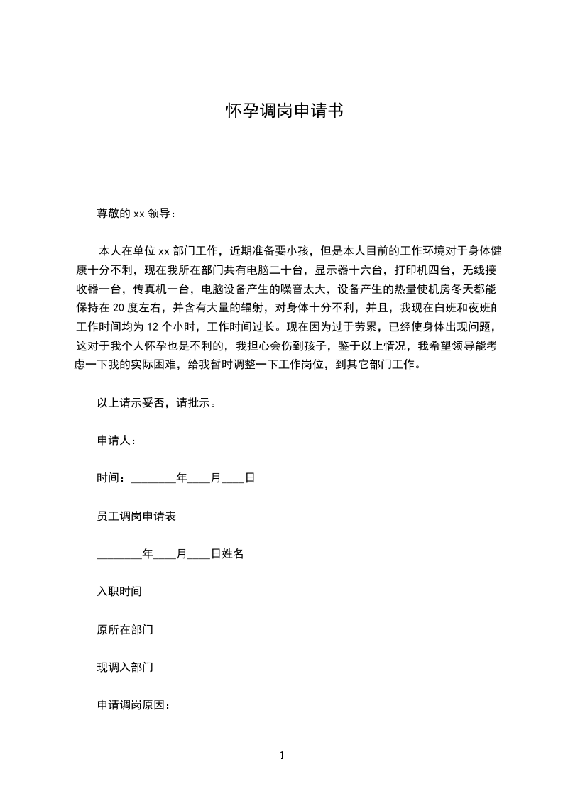 本人在单位xx部门工作,近期准备要小孩,但是本人目前的工作环境对于身体健康十分不利,现在我所在部门共有电脑二十台,显示器十六台,打印机四台,无线接收器一台,传真机一台,电脑设备产生的噪音太大,设备产生的热量使机房冬天都能保持在20度左右,并含有大量的辐射,对身体十分不利,并且,我现在白班和夜班的工作时间均为12个小时,工作时间过长。现在因为过于劳累,已经使身体出现问题,这对于我个人怀孕也是不利的,我担心会伤到孩子,鉴于以上情况,我希望领导能考虑一下我的实际困难,给我暂时调整一下工作岗位,到其它部门工作。