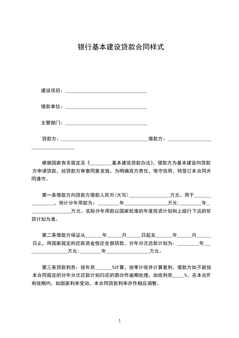 根据国家有关规定及《_________基本建设贷款办法》,借款方为基本建设向贷款方申请贷款,经贷款方审查同意发放。为明确双方责任,恪守信用,特签订本合同共同遵守。