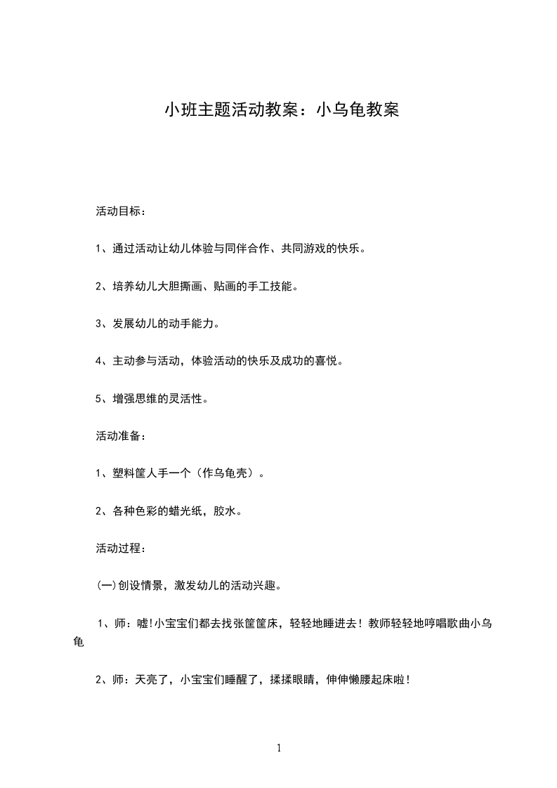 1、谈话引出课题。师:你们见过小乌龟吗它是什么样子的幼儿:小乌龟有四只脚,一个壳,一个头,一个尾巴,壳上还有花纹。师:你们想不想自己制作一只小乌龟