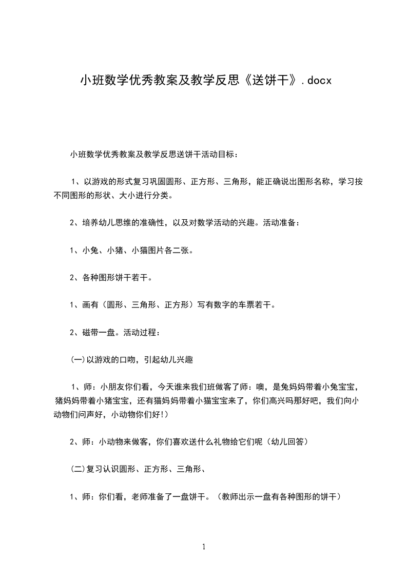 2、师:咦,盘子里的饼干是怎么样的它们都有哪些不同(师:噢,我准备的有大的、小的圆形饼干;有大的、小的正方形饼干;还有大的、小的三角形饼干)