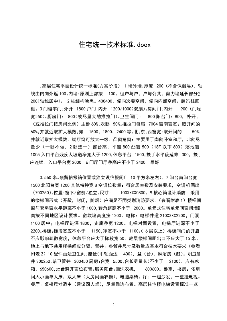 .高层住宅平面设计统一标准(方案阶段)1墙外墙:厚度200(不含保温层),轴线由内向外返100。内墙:原则上都按100。但户与户,户与公共,剪力墙延长部分按200(轴线居中)。2柱结构涂黑。400400,偏向次要空间,偏向内部空间。装饰柱画框。3门楼宇门:外开1800户门:内开1200/1000(双扇)。房间门:内开900(门垛宽>50)。厨房门:800(或尽量大的推拉门)。卫生间门:800阳台门:800,外开,(或推拉门按房间比例)主卧60%,次卧50%。推拉门每扇7004窗南窗宽:取开间的60%,并就近取扩大模数,如1500,1800,2400等。北,东,西窗宽:取开间的50%,并就近取扩大模数。端厅窗可放大一级。凸窗角窗:主要用于南向卧室和厅,北向尽量少(一卧不做,2卧选一)窗台高:平窗800凸窗500(18F以下600)落地窗1005入口平台残疾人坡道净宽大于1200,休息平台1500,扶手水平段延伸300,扶手应连续。入口平台宽2000。6门厅门厅净高应不小于2400。最好