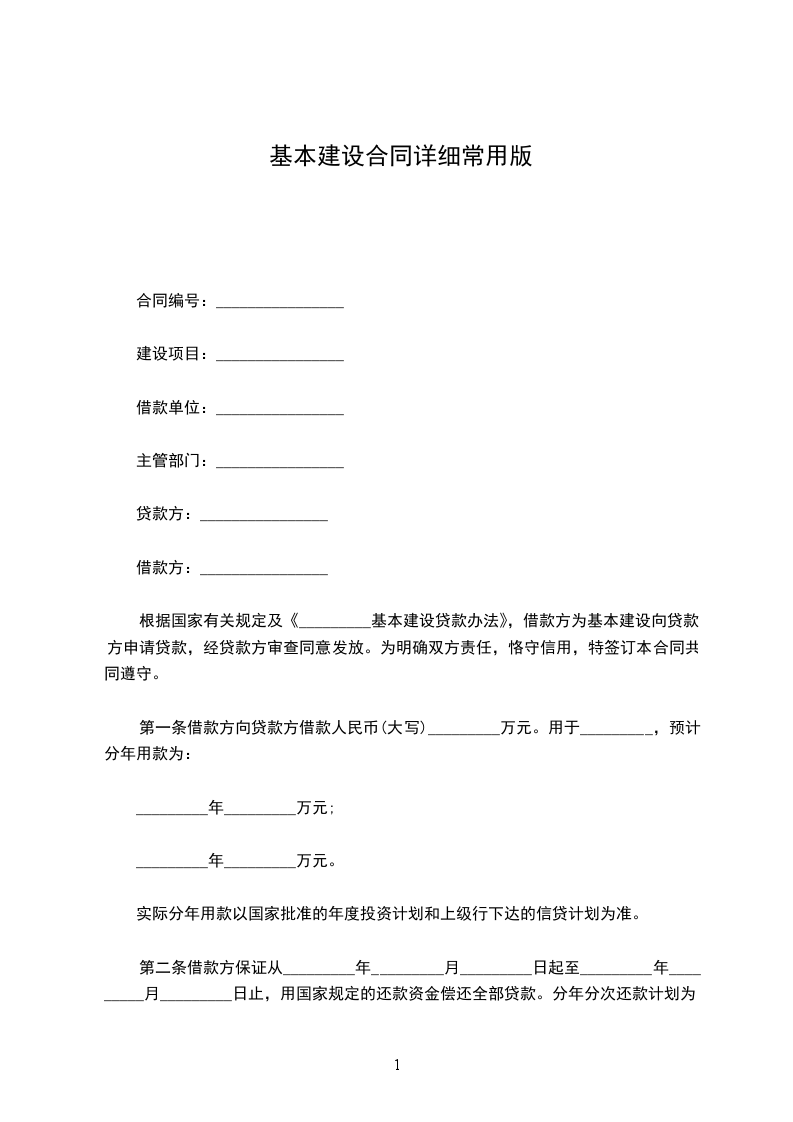 根据国家有关规定及《_________基本建设贷款办法》,借款方为基本建设向贷款方申请贷款,经贷款方审查同意发放。为明确双方责任,恪守信用,特签订本合同共同遵守。