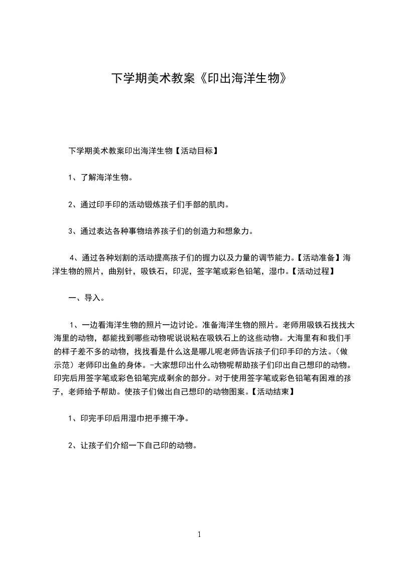 下学期美术教案印出海洋生物【活动目标】