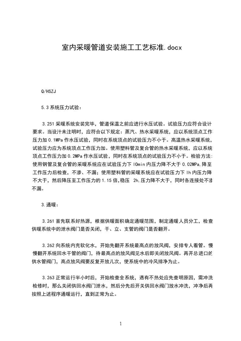 3.264冬季通暖时,必须采取临时取暖措施,使室温保持 5C以上才可进行。遇有热度不均,应调整各分路立管、支管上的阀门,使其根本到达平衡后,进行正式检查验收,并办理验收手续。4质量标准