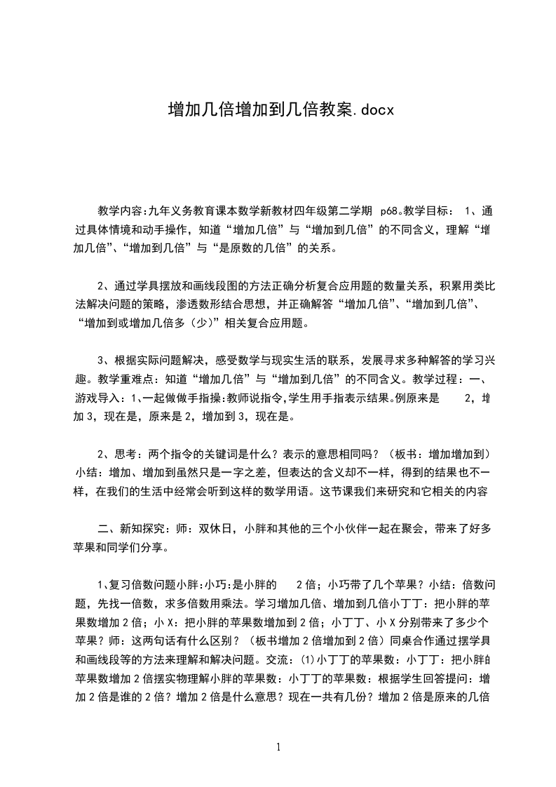 教学内容:九年义务教育课本数学新教材四年级第二学期p68。教学目标:1、通过具体情境和动手操作,知道“增加几倍”与“增加到几倍”的不同含义,理解“增加几倍”、“增加到几倍”与“是原数的几倍”的关系。