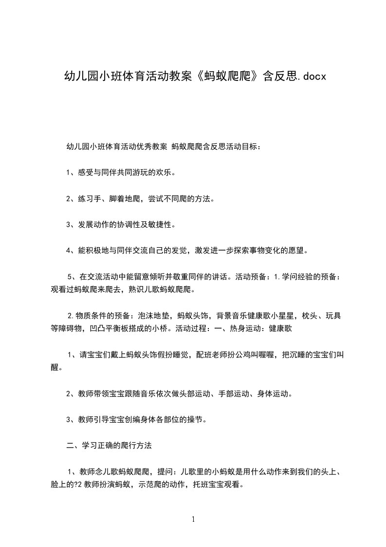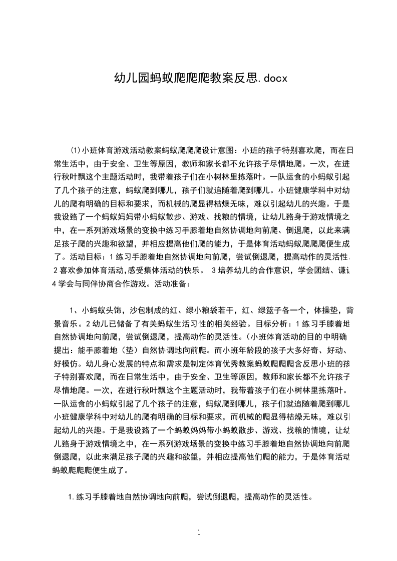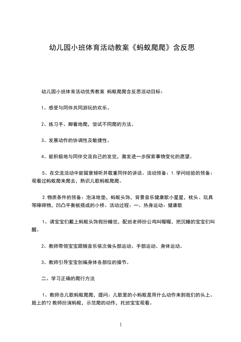 (2)巩固倒退爬4游戏:蚂蚁背礼物。a找礼物师:宝宝们,新年就要到了,让我们寻找新年礼物准备过新年吧!b背礼物回家请幼儿将红、黄、绿三色的礼物按颜色标记运回相应的篓子。5放松练习,结束活动。小蚂蚁跟着妈妈随音乐做放松活动。(鼓励幼儿先自己拍拍手臂、膝盖,再互相拍拍手臂、膝盖。)活动反思:小班的孩子特别喜欢爬,而在日常生活中,由于安全、卫生等原因,教师和家长都不允许孩子尽情地爬。一次,在户外活动中,我带着孩子们在梧桐树下拣落叶。一队运食的小蚂蚁引起了几个孩子的注意,蚂蚁爬到哪儿,孩子们就追随着爬到哪儿。小班健康学科中对幼儿的爬有明确的目标和要求,而机械的爬显得枯燥无味,难以引起幼儿的兴趣。于是我设置了一个蚂蚁妈妈带小蚂蚁散步、游戏、找粮的情境,让幼儿置身于游戏情境之中,在一系列游戏场景的变换中练习手膝着地自然协调地向前爬、倒退爬,以此来满足孩子爬的兴趣和欲望,并相应提高他们爬的能力,于是体育活动蚂蚁爬爬爬便生成了。在这次活动中,我发现小班的孩子最喜欢在情景游戏中开展活动,孩子们喜欢小蚂蚁,扮演聪明可爱的小蚂蚁会让他们觉得很有趣。过“小桥”、“寻声爬”、“抢救小动物”等,整个活动以游戏的方式贯穿始终,孩子们和“妈妈”(教师)一起游戏玩耍。自然轻松而富有亲情的游戏氛围让孩子们感受到集体活动的无穷乐趣。在玩的过程中孩子们较好的掌握了爬的基本要领。在这次活动中,我依据循序渐进的原则,自由爬一个接着一个爬尝试倒退爬背着物体爬等一系列游戏活动,不断提高练习的要求,逐步发展孩子们动作的协调性和灵活性。由于“开展好体育活动,如何在体育活动中锻炼孩子的胆量,鼓励孩子们合作交流,我想每一次的活动都是一次学习和提高的过程。