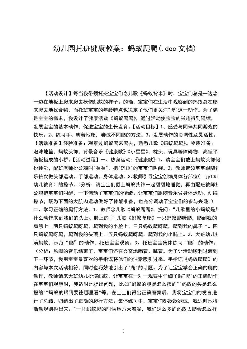 (1)小班体育游戏活动教案蚂蚁爬爬爬设计意图:小班的孩子特别喜欢爬,而在日常生活中,由于安全、卫生等原因,教师和家长都不允许孩子尽情地爬。一次,在进行秋叶飘这个主题活动时,我带着孩子们在小树林里拣落叶。一队运食的小蚂蚁引起了几个孩子的注意,蚂蚁爬到哪儿,孩子们就追随着爬到哪儿。小班健康学科中对幼儿的爬有明确的目标和要求,而机械的爬显得枯燥无味,难以引起幼儿的兴趣。于是我设臵了一个蚂蚁妈妈带小蚂蚁散步、游戏、找粮的情境,让幼儿臵身于游戏情境之中,在一系列游戏场景的变换中练习手膝着地自然协调地向前爬、倒退爬,以此来满足孩子爬的兴趣和欲望,并相应提高他们爬的能力,于是体育活动蚂蚁爬爬爬便生成了。活动目标:1练习手膝着地自然协调地向前爬,尝试倒退爬,提高动作的灵活性。2喜欢参加体育活动,感受集体活动的快乐。3培养幼儿的合作意识,学会团结、谦让。4学会与同伴协商合作游戏。活动准备: